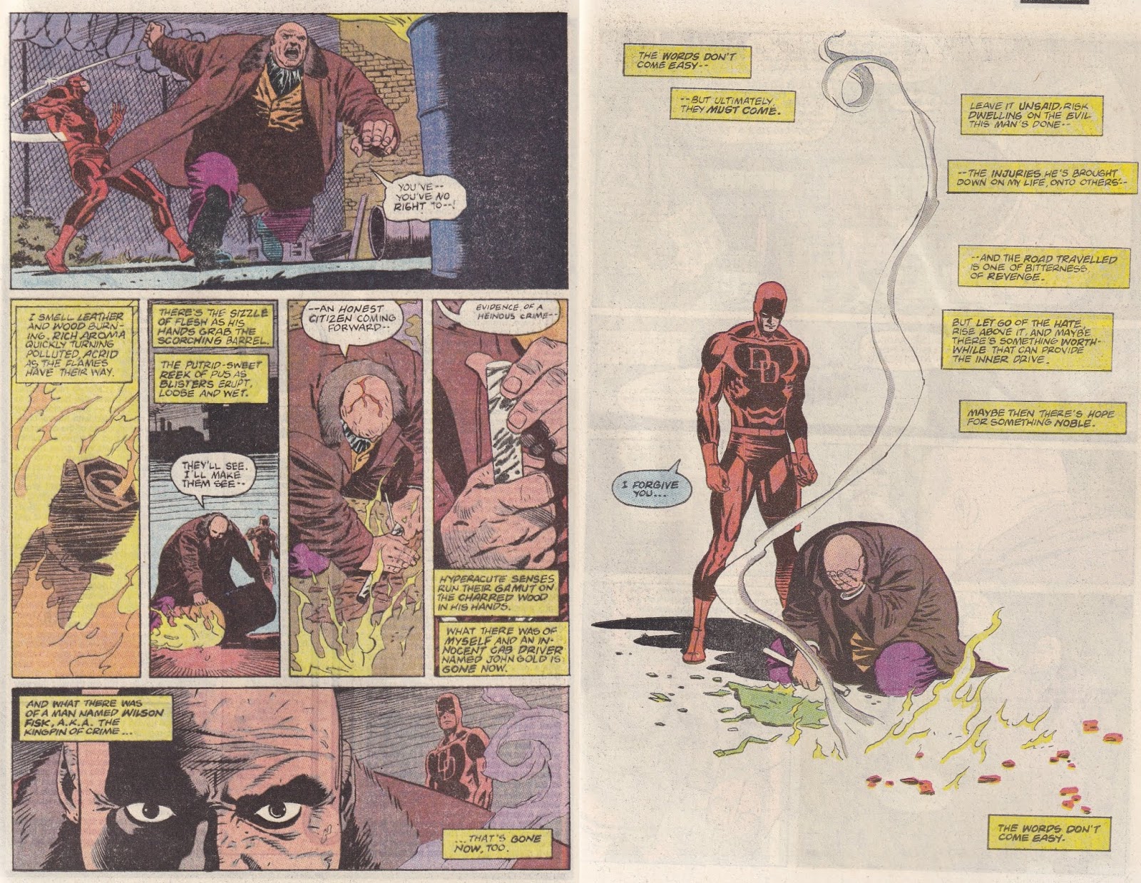 Issue #300 is the culmination of the story, obviously, and although it seems like the Kingpin can’t fall any further, Chichester makes it clear that he can. He is brought in by the Feds. The prosecutor, Kathy Malper, tells Daredevil he plays the role of wounded spice merchant too well, and the grand jury might not indict him. Daredevil has a plan to crack the last bit of his facade. This will lead to the grand guignol between the two men, and ties nicely back into the foundation laid by Frank Miller. The Kingpin hears that a state senator is willing to help him if he can find the killer of a cab driver, who was her cousin. That cab driver is the same one the Kingpin had killed during “Born Again” when he put Matt Murdock in the taxi and sank it in the river. He used Matt’s billy club to bludgeon the man to death, and then made sure Matt’s fingerprints were all over the club. He then locked the club away for safekeeping, “for a rainy day,” and now it’s pouring. The whole thing is a set-up – there is no deal, and Matt wanted to draw Fisk out into a desperate public situation, so that everyone would know what kind of man he really is. Fisk has nothing left, and he snaps. When his credit card is rejected, he smashes the window of the parcel check area where he stashed the club and drags it and the clerk out, and Weeks shrouds his face in shadows, with nothing hiding his true nature from the world any longer. The fight in the bus terminal is a ballet of violence and retribution, as Fisk scrambles to escape and Daredevil follows gracefully, fully aware of everything Fisk could do and fully in control. He thinks to himself, “If I could see, I know I’d view it there on his face. The dread certainty of what all his machinations, all our confrontations – of what all of it’s come down to. A man filled with panic. And a man without fear.” He has broken Fisk, and all that remains is to pick up the pieces and make sure that the billy club, which could, after all, be used as evidence, is destroyed. As Fisk staggers out of the terminal (and in front of Peter Parker, who lets Daredevil enjoy his moment), Matt thinks to himself, “If it were anyone else, I might even feel pity.” In a much more subtle way than the more recent fall of the Kingpin (the Bendis one), Chichester lets us know that Matt has taken Fisk’s place, much like he took Bullseye’s place. “The abyss gazes also” and all that, but Matt can be better than that. On a wonderful page, after Fisk has lost everything, Matt stands over him and thinks, “The words don’t come easy … But ultimately, they must come.” He forgives Fisk, because he knows that he must let go of the hatred and be the better man. Perhaps then, there is “hope for something noble.”