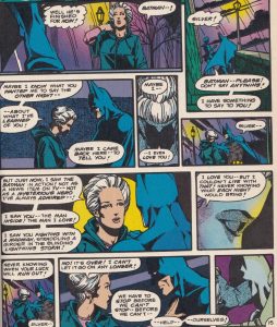 So she skips town, only to break down and bum a ride from … Rupert Thorne, who is also fleeing Gotham City (for his own reasons, which we’ll get to). Issue #476, as well as being the culmination of Batman’s battle of wits with the Joker, is also the resolution of Silver’s feelings about Bruce. While driving with Thorne, she gets into an argument with him about Batman’s place in the city. Again, Englehart gives us a nuanced portrait of a real woman, one who was frightened of her feelings and what it would mean to take up with Batman, but one who, when pushed, pushes back and stands up for what is right and wrong. Thorne kicks her out of the car because she dares to defend Batman, and she realizes that she has to go back and confront Bruce and hash out her feelings. The climax of the issue is not Batman’s fight with the Joker, interestingly enough, but his final conversation with Silver. The Joker, after all, is just another threat to be beaten up. Silver is the perfect woman for Bruce, and it’s fascinating to read and look at their breakup. Batman doesn’t get to say anything – all he gets out is her name before she lowers the boom. However, Englehart and especially Rogers, showing the Batman pleadingly put his hand on her shoulder, let us know that he is perfectly willing to try to make a life with her, even to the point of giving up his nocturnal activities. I might be reading too much into this, and of course DC wouldn’t allow that, but it seems clear that Englehart was writing a Batman who would quit to be with Silver, but she never gave him the chance. At the beginning of issue #475, he confronts Silver in her apartment – he seeks her out because she called his name at the end of issue #474. He is torn between revealing himself and allowing her to tell him what she knows, and again, we see his indecision and also his desire to take off his mask and end the charade once and for all.