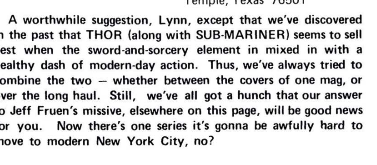 Over at Marvel, Roy Thomas and Marie Severin were dipping their toe into sword-and-sorcery in ’69 with the Serpent Crown saga in Sub-Mariner. Some readers wanted more of the same but a later letter column in Thor said not enough did.