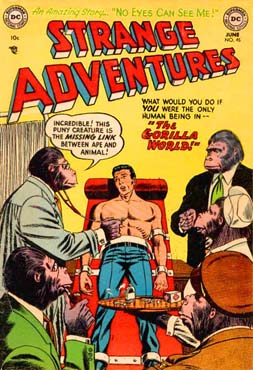 I’ve had the most fun though with the Gorilla World collection, reprinting a string of1953 and 1954 Mystery in Space and Strange Adventures issues. It seems to start randomly — there’s nothing significant I can see about the issues they pick to open with — and the stories aren’t as strong as they’d become a few years later. But as I wrote a few years back, these series are typically better than they needed to be, and head and shoulders above DC’s other SF anthologies (e.g., Tales of the Unexpected) or Marvel’s SF/monster books. They’re way better than the Tommy Tomorrow stories from the same era, which are also included in the book.