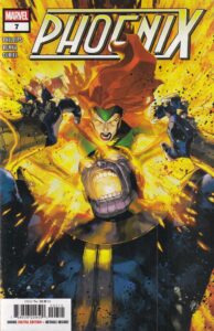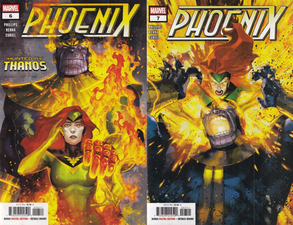 In modern comics, the two things that probably aren’t going away and which really make modern comics somewhat un-fun to read are the length of the issues and the devotion to plot churn. Issue #1 of Phoenix is 30 pages, and it feels like Phillips takes good advantage of the length to give us a lot of interesting set-up. Each subsequent issue is 20 pages, and I know it’s only 2 pages, but the drop-down from 22 to 20 pages an issue has still, after so many years, felt like we’re getting a lot less in each issue. Part of this is, of course, writing styles — if you look at panels-per-page from a modern comic as opposed to one from the 1980s or before, they’re probably about the same, but there’s probably more text in the older comic — but part of it feels like writers still haven’t adjusted. This means that it feels like we get less in each issue, and with modern comics’ devotion to plot churn, this makes things even worse. Marvel seems more committed to this than DC, but in modern superhero comics, the forward momentum is almost overwhelming. No one can stop and smell the roses at all, and we just get one hyperactive event after another, and it’s exhausting. These two factors lead to a lack of character development and a lack of emotional investment on the part of the reader. It’s frustrating, because if you get a writer who knows what they’re doing — and Phillips might not be the greatest writer, but she knows what she’s doing — you can almost see them straining against these artificial impositions, and it becomes even more frustrating.