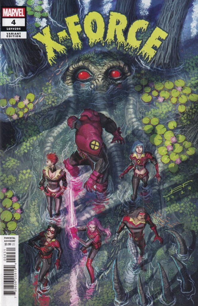 I mean, come on — did you think Ferreyra would draw a cover that I wouldn’t think is the best one? Look at how cool this thing is — Man-Thing in the swamp as the team walks over him, his claws reaching for Forge, everyone looking around because they know something just ain’t right, the perspective of the entire cover … Ferreyra just fucking gets it.