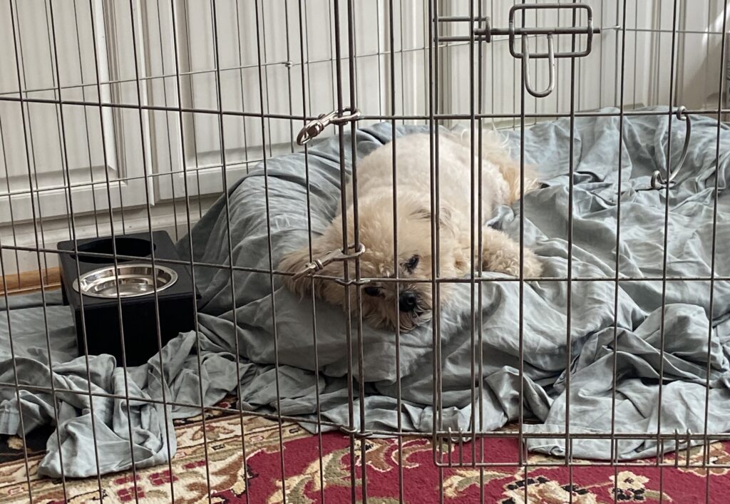 We’ve scheduled surgery but he’s adapted surprisingly well to his bum leg, helped by generous quantities of pain meds. Unfortunately adapting includes deciding that he can jump off things, run down stairs, run across the floor just fine. While this is good, it necessitates keeping him caged. Between long naps he’s barking to the point he’s getting hoarse; I sit in the cage with him sometimes to help.