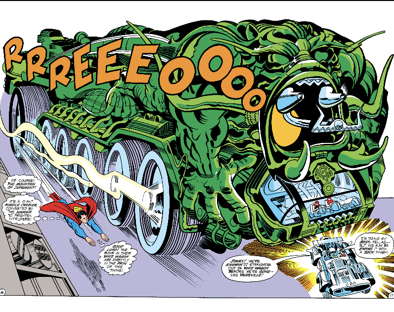 Following on from Kirby’s debut issue on the book, it has Jimmy and the Newsboy Legion investigating the Wild Area, unaware that Jimmy’s new boss, Morgan Edge, has booby-trapped their news camera to blow up that ginormous vehicle on behalf of someone named Darkseid (hmm, he sounds ominous). It’s fun and imaginative though this scene is bizarre.