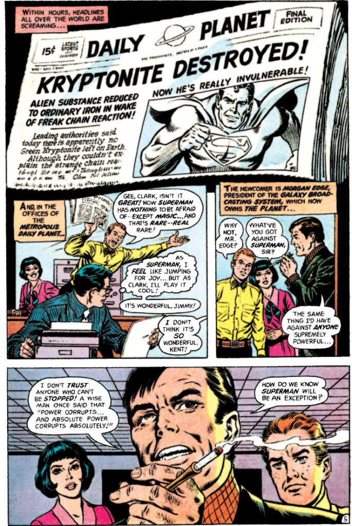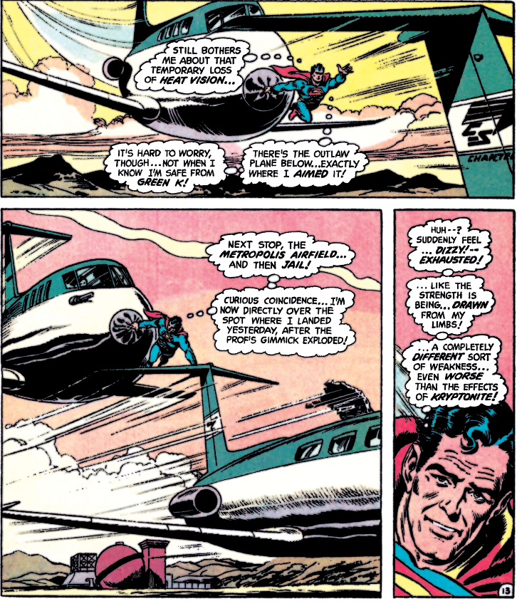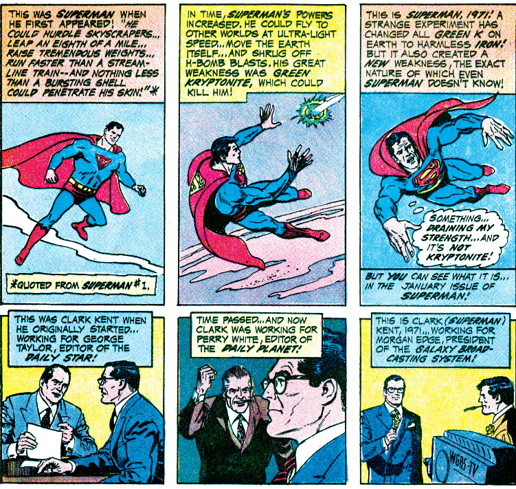 The third change, only hinted at here, is that Superman is having spasms of weakness for no discernible reason. What’s with that? Here’s the ending hint.