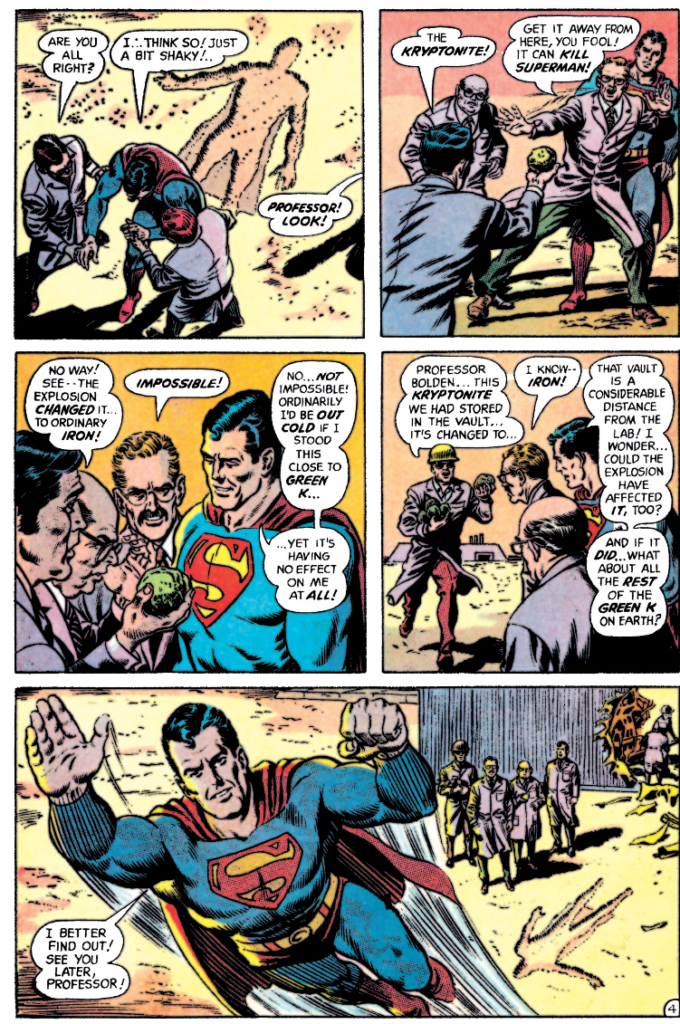 Kryptonite was one of the things that defined Superman in the 1950s and 1960s. Any fan could tell you the different colors (red, gold, blue, white, jewel) and their effects; it was what kept the Man of Might from being unstoppable to the point of boring. In this issue, though, a chain reaction in a kryptonite-fueled nuclear power plant converts all kryptonite on Earth to iron.