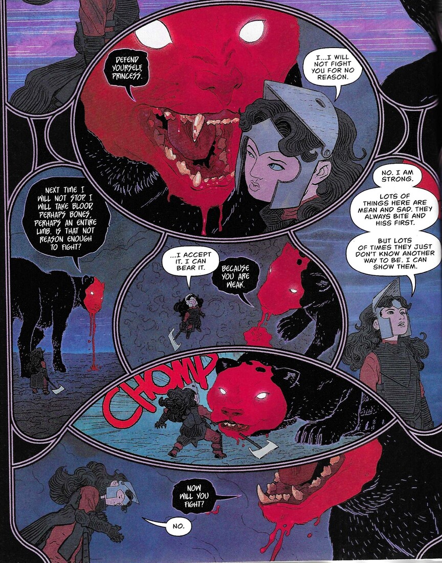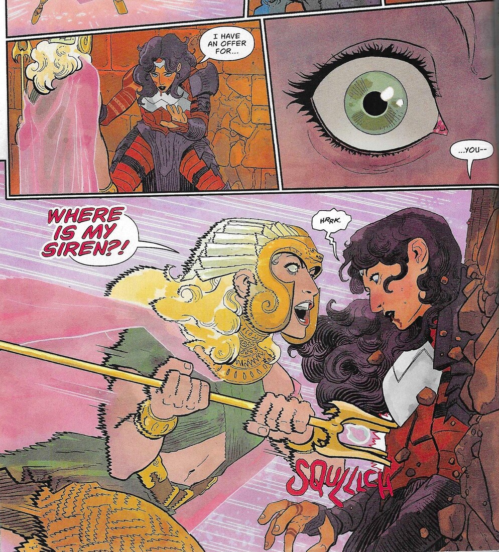 Like the first volume, Thompson writes Diana as a person who will do absolutely anything else before using violence, and while some writers could not make that work, Thompson does. Diana gets into the labyrinth and finds a minotaur (named Ferdinand, of course) who looks hostile initially but isn’t, so Diana teams up with him. He’s protecting a siren from the ruler of the maze, Clea, who wants the girl for unknown reasons.