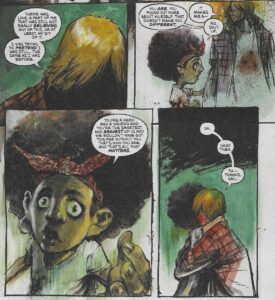 The book veers from black and white to color, and Wayshak does a very good job with the coloring, using warm and cold colors to nice effect when they’re called for. He has a loose, slightly cartoonish style, too, which works most of the time. The characters react very emotionally to a lot of things, and Wayshak does a good job distending their faces as the shit continues to hit the fan. The one issue I have with his work is that the kids’ heads are oddly big. He does a good job making them look like kids — not small adults, in other words, which sometimes happens — but their heads are out of proportion with their bodies. It’s … weird.