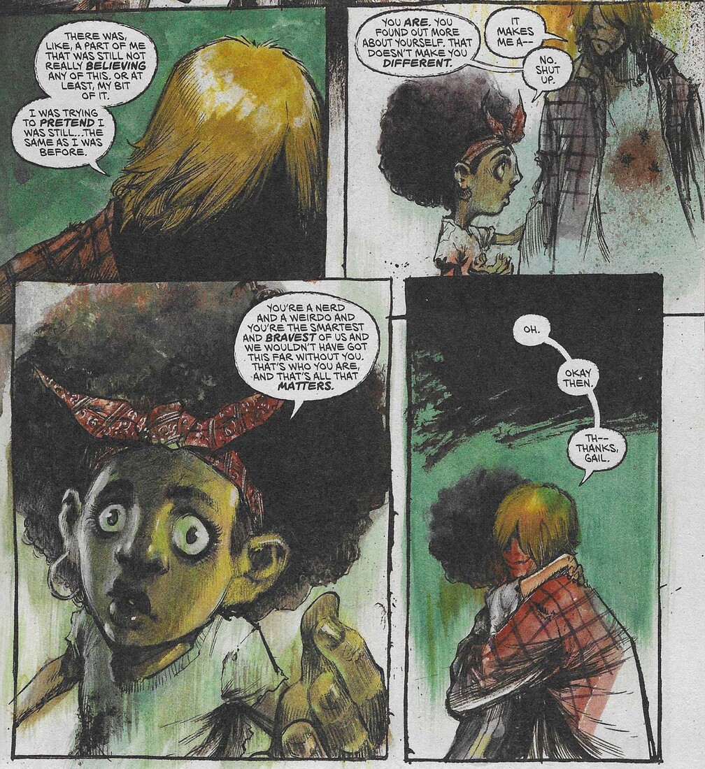 It’s a good hook, and Carey does nice work with it. The vampire hunters are working for a mysterious dude who, when he hears about the deaths, sends a mysterious, super-tough lady to clean things up. Jagger, as she calls herself, is very creepy and efficient, and she is, of course, hiding something from the vampire hunters. Gail finds a number on her mom’s phone that connects her to a dude in Texas, so that’s where they’re going. It turns out he’s a vampire, so the hunters get there first and set a trap, but he convinces them that Jagger and her group are much, much more dangerous than the kids, and perhaps they’d like to defend the children instead of killing them? There’s a lot going on, in other words. Carey does a good job unspooling the story, as the surprises aren’t really that surprising, but he knows how to get to each beat well, with some nice misdirection thrown in that isn’t confusing but does keep us on our toes a bit. The kids don’t know what they are, so they slowly discover what they’re able to do, and it makes the more confident and stronger. Carey does a good job giving each of them interesting personalities, so they play off each other well. Gail and one of the boys, Robert, are a bit older and a bit more mature, while Gail’s sister, Sam, and the other boy, Callum, are a bit younger and wilder.