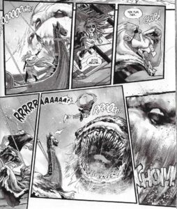 The action scenes in the book are marvelous, as his thin, curvy line feels like it’s always in motion, so when he draws stuff actually doing things, it really leaps off the page. His character designs are terrific, and he does an excellent job with the wintry setting, making us really feel the cold. In flashbacks, he uses a watercolor style which contrasts nicely with the harder edge of the freezing present, and the little color in the book really pops, because the rest is so starkly black and white. He uses blacks really well, almost throwing it onto the page to scar the drawings, giving us a very good idea about how tough everything is. Then there are a few silly panels, which breaks up the bleakness nicely and which he handles very well. The book looks very cool, which helps the story quite a bit.
