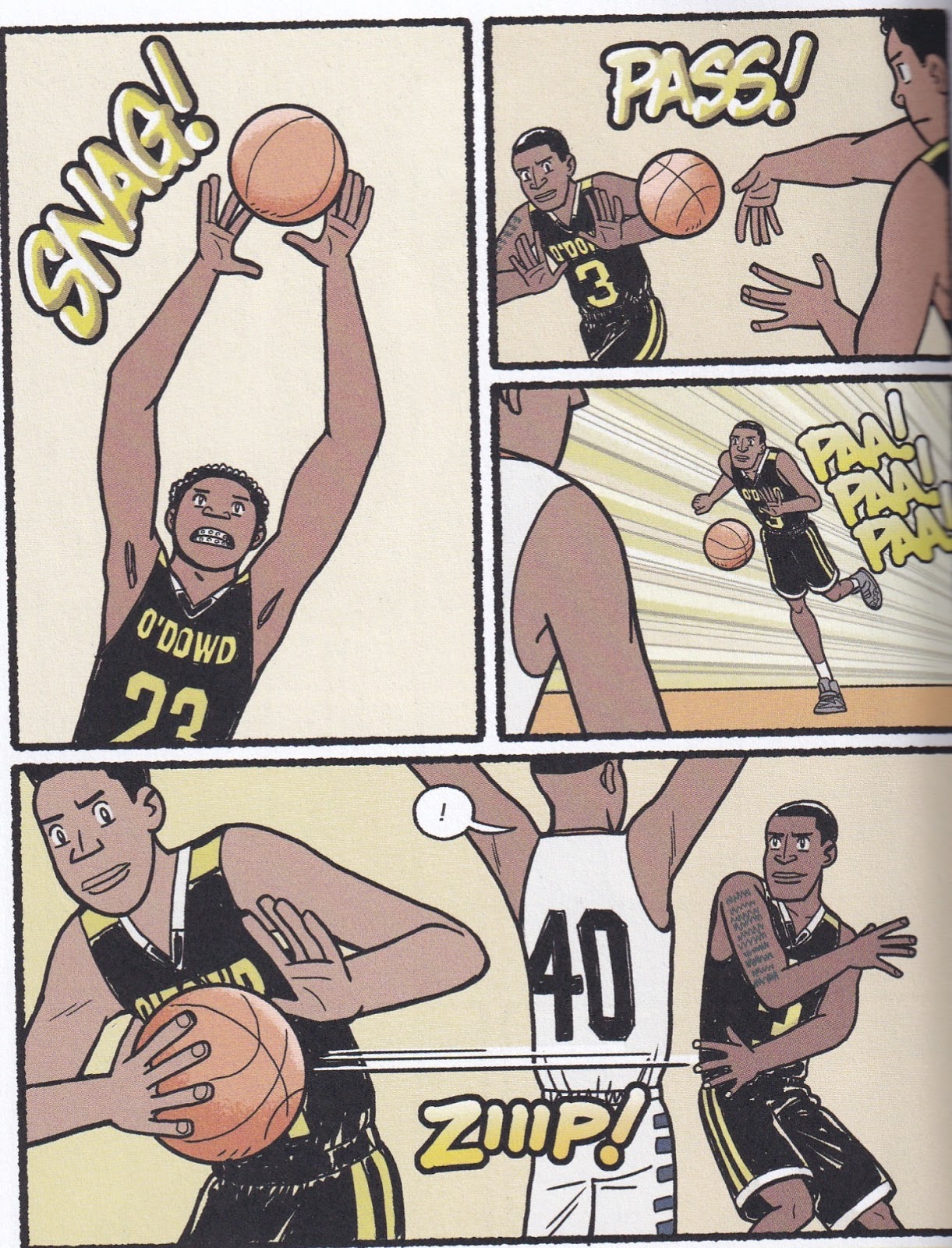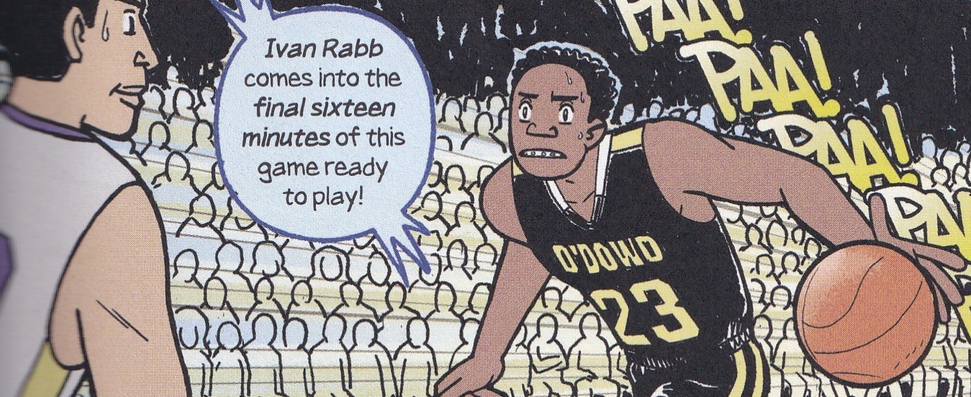 He likes to do consecutive panels of the same “shot” of a character, with just a different facial expression, showing how they’re working through something they might not want to say out loud, and it works quite well. He makes sure the kids look like kids, even if they’re big, because it’s easy to forget that when they’re on television and in pressure-packed situations like the ones Bishop O’Dowd finds itself in. So we always know that these are teenagers trying to bring vicarious glory to adults, and Yang does a nice job with that. He uses speed lines cleverly, and his sound effects work quite well in the context of the book. When he shows the history of the game, colorist Lark Pien uses the slightest sepia tones to set them apart, which works nicely. While his in-game work often feels like it’s taking place in a far vaster space than a basketball court, that affectation helps us focus in on the players he wants to highlight, so it’s not a bad thing. Yang’s art style is never going to change the world, but he’s a very good storyteller.
