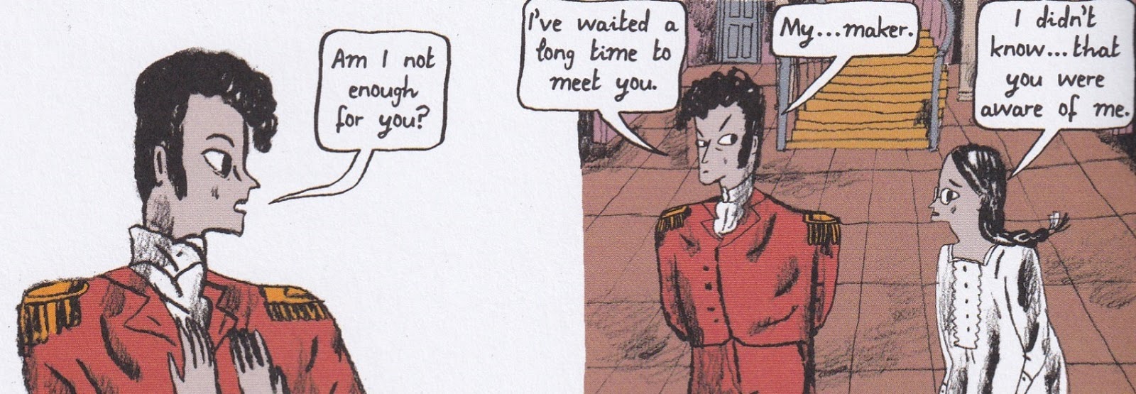 Glass Town is one of the better comics I’ve read so far this year, and it makes me want to go get more of Greenberg’s work (she’s done two other graphic novels, but I didn’t get them). She creates two fascinating worlds, and uses the historical setting to make deep points about life, the desire to escape a tragic world, the consequences of that desire, and the difficulty we occasionally have facing the real world. It’s a book that makes you stop and think about it a lot, but it’s also pretty gripping, which seems unlikely when you learn what it’s about but doesn’t seem too shocking after you’ve read it. Even if you’ve never read Jane Eyre or Wuthering Heights (and if you haven’t, shame on you, because, as I noted above, they’re both brilliant), you can appreciate a comic like this. I encourage everyone to check it out!