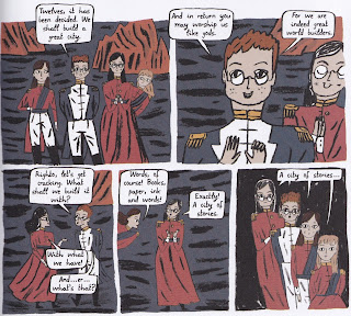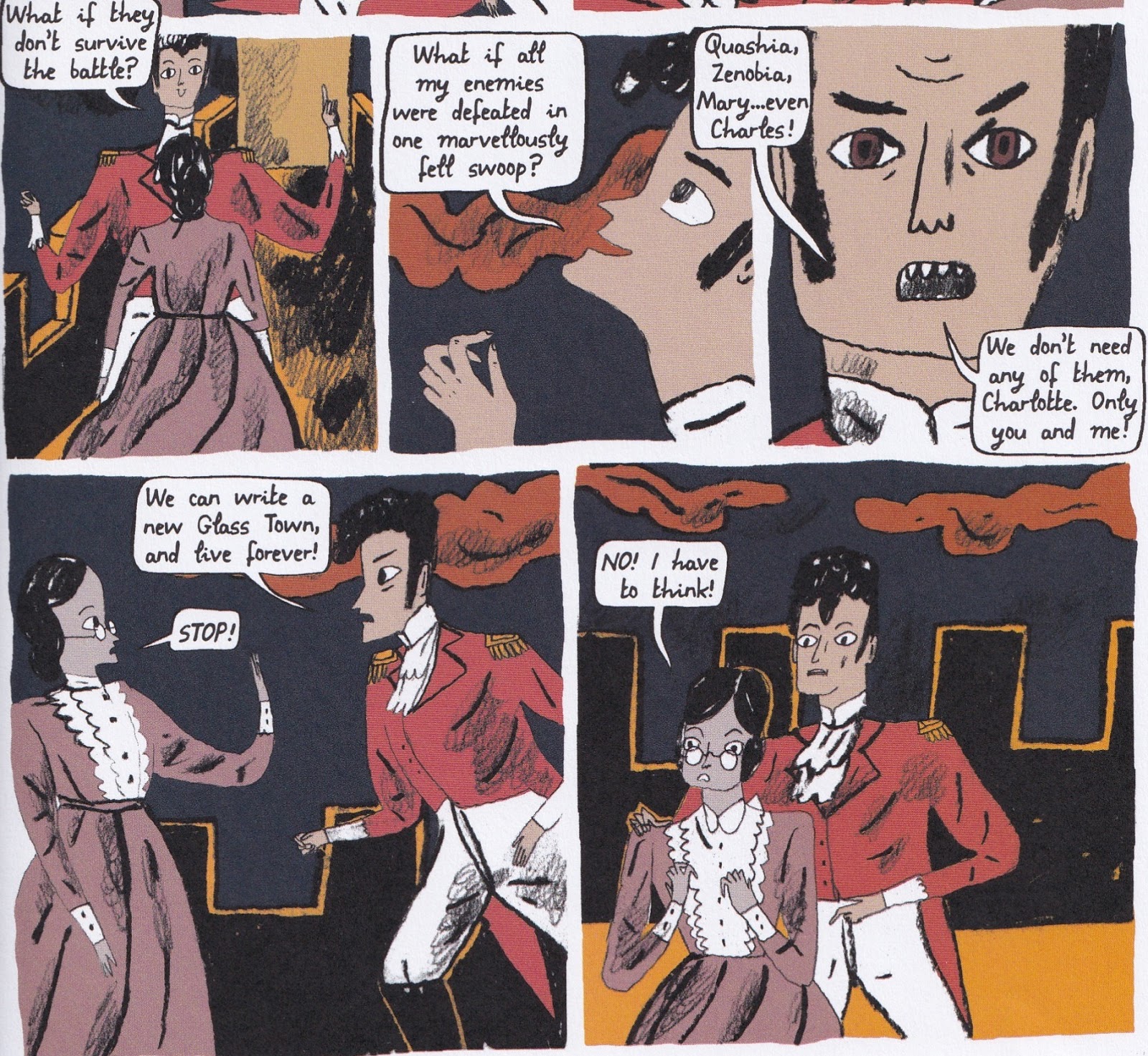 The coloring does change, which is a smart thing, as it’s a fantasy world, so the colors pop a bit more and stand in nice contrast to Charlotte’s drab world, and the warm colors Greenberg uses help create the sense of the tropics, which is one reason why Emily and Anne want to start their own world (they want a different climate). The brighter colors also heighten the luridness of the story, and we begin to understand why Charlotte would want to spend so much time there – everything feels more alive, despite the fact that it’s not real. Greenberg is already making a contrast between the real world and the fantasy world, and the art and coloring help make it starker. When Charlotte “enters” Glass Town, Greenberg doesn’t make her fancier, so the contrast is even clearer. I’m not sure how deliberate this is, but Greenberg’s characters are also a bit more angular than the “real” characters, giving them a harsher but also slightly more dashing look, which also highlights their “unreality.” The “real” characters in the book are a bit more rounded and softer, as they don’t smash through life doing whatever they want like the denizens of Glass Town. I’m going to assume it’s deliberate, because it’s fairly interesting and subtle.