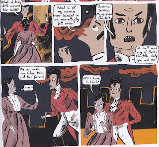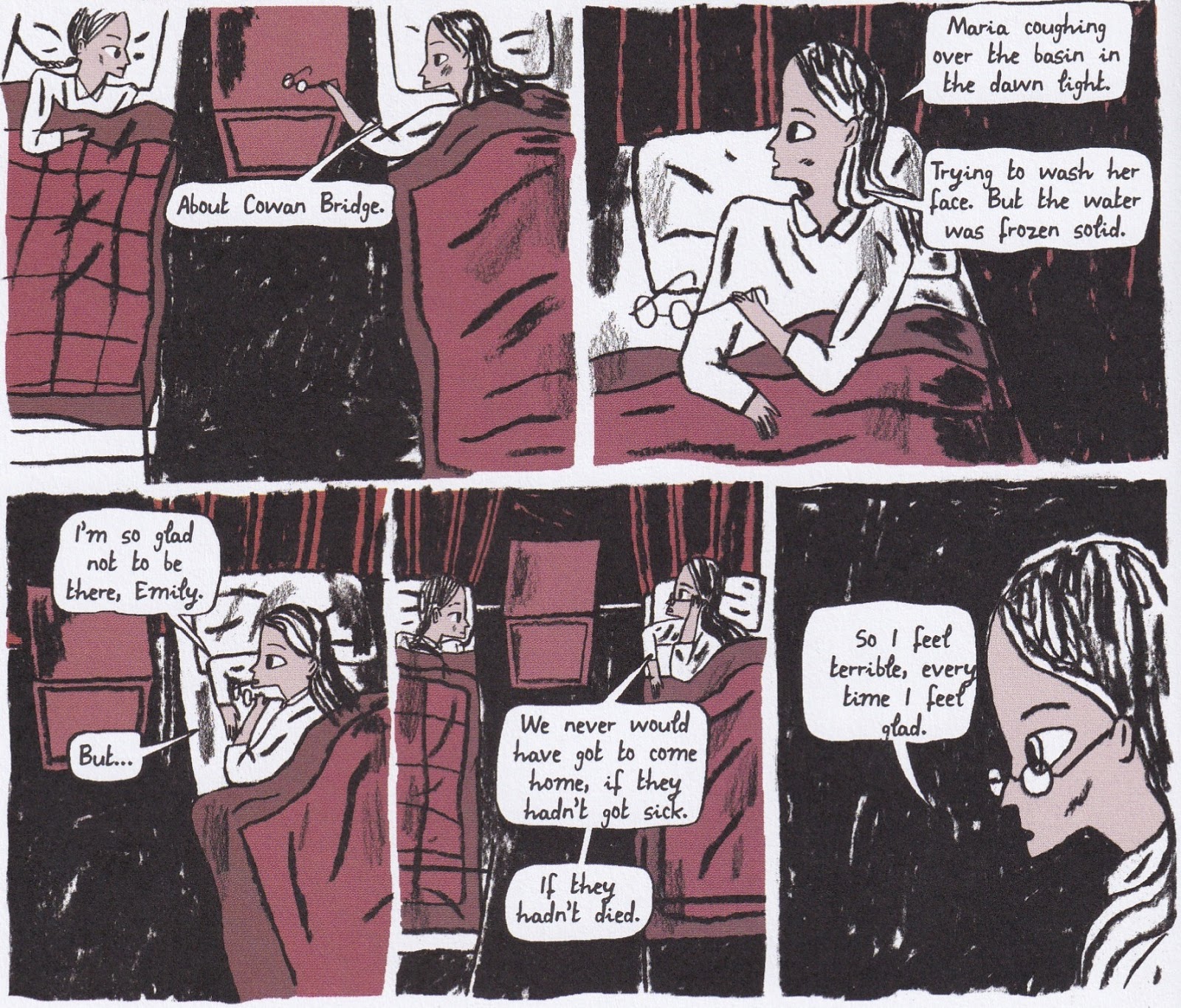 Her art is interesting, as well. She uses heavily inked, rough pencils (or perhaps just thick brushes) with a lot of smudging to give the world a very harsh look, which works well for the wilds of Yorkshire and the sparseness of the school where Charlotte works. Her characters also look toughened by life, both by the events they’ve lived through and the places in which they’ve lived through them. The book takes place in the 1820s-1840s, and even someplace nice like the Brontës’ house would feel dingy, based on the way it was lit and heated, while the people could wear nice clothes but they would probably be a bit shabby. Greenberg gets this, and while everyone is dressed well, there’s still that sense of dirtiness that would be prevalent at this time. When we get to Glass Town, everyone is dressed like aristocrats, but they’re still presented as a bit shabby.