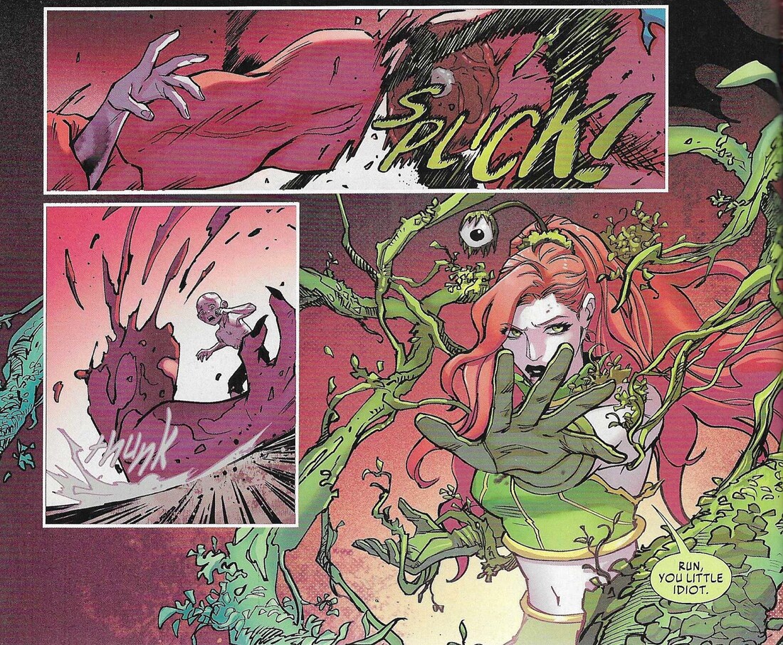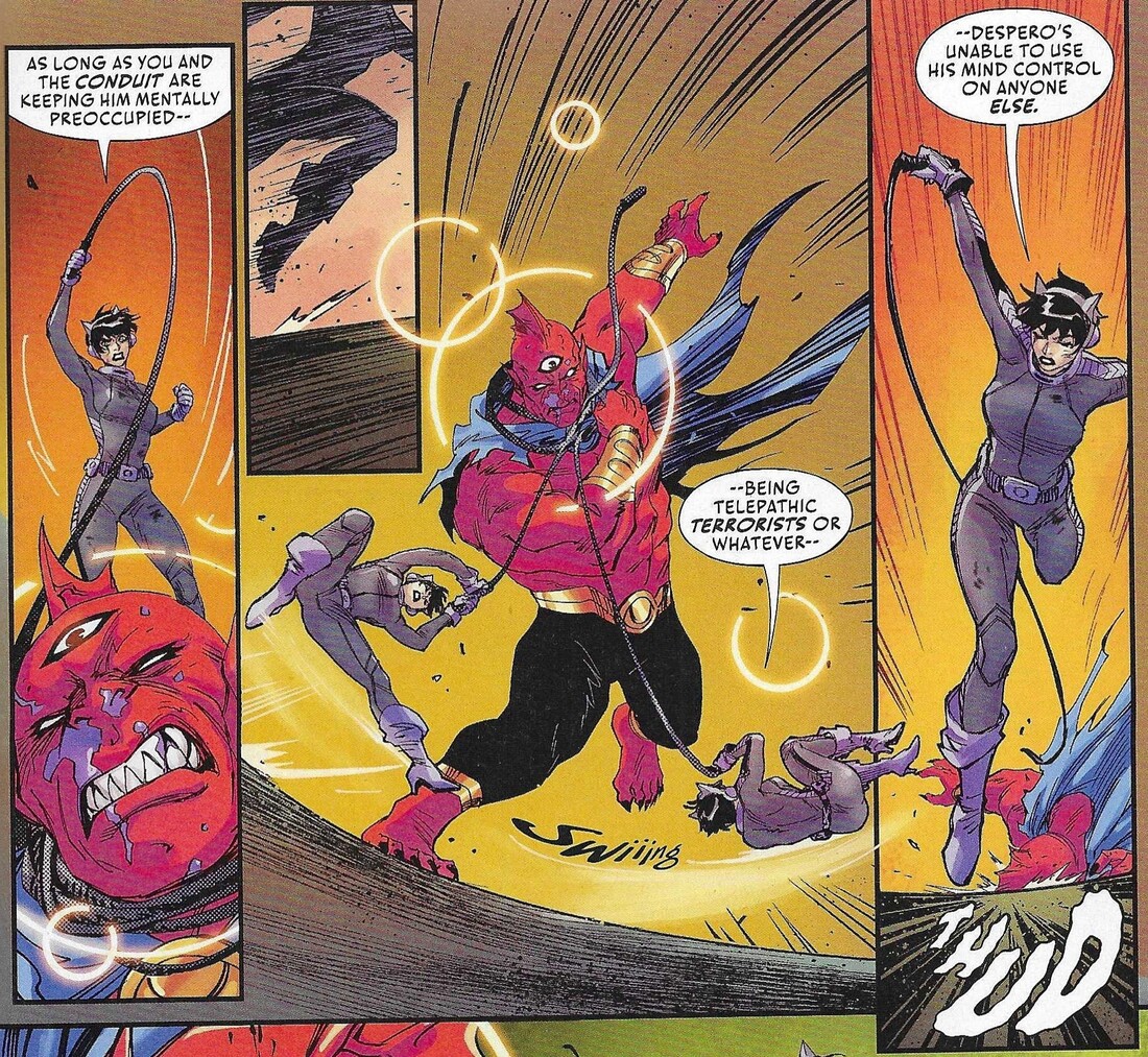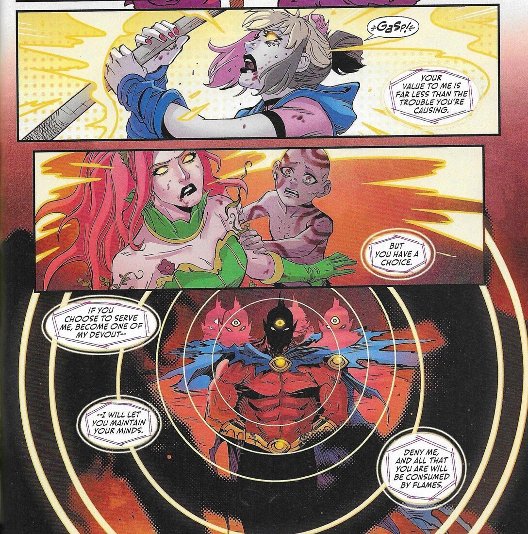 Look, I like Despero. He’s not the greatest bad guy in the world, but he can be pretty interesting. He has that whole “third eye” thing going on, which gives him psychic powers, which you don’t usually associate with big hulking thugs, and he has a pretty cool visual. But creators Gardner Fox and Mike Sekowsky didn’t seem to think too much beyond the visuals, and Despero’s been in a kind of super-villain rut ever since, as subsequent writers bring him in when they need someone to conquer the Earth but they don’t seem to give him much motivation beyond that. Leah Williams doesn’t do much with him in this series, either — he’s there to conquer the Earth, but he doesn’t tell us why, nor does anyone ask. As I noted when I first reviewed this, putting Selina, Harley, and Pam up against him is ridiculous because he’s so powerful (in the first Despero story I ever read, J’onn J’onzz — the friggin’ Martian Manhunter —