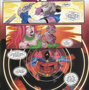 had to trick him to beat him), and Williams has to pull the old “he’s so powerful he underestimates them” thing, where instead of killing them, he tries to enslave them, while not even taking them to the transformative Flames of Py’tar himself, but separating them and messing with them because he’s so arrogant. Come on, Despero, don’t turn into a Bond villain! Meanwhile, there’s an ill-defined MacGuffin in the book, which, because it’s a MacGuffin, shouldn’t matter that much, but it does seem to be more important than these things usually are, so Williams should really do more with it. Instead, this is basically an excuse for our three heroes to run around bashing underlings. I mean, that can be fun, sure, and Williams does a nice job putting them in bad situations and then getting out of them, but this is really the emptiest of caloric treats. Williams does have one clever trick up her sleeve, and it’s fine, but again — Despero has been doing this kind of thing for a long time, and he’s supposed to be a genius as well as powerful, so I can’t believe the Sirens’ gambit would work, especially as he finally stops underestimating them. Oh well — it’s a fun read, I guess, I just don’t love writers using villains whose power set does not really work in the story. Despero, despite getting defeated by our heroes, is still far too powerful for them. Williams has to twist the story too much to make it work.