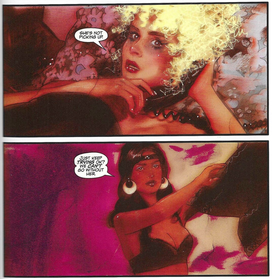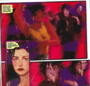 So, again, while we know what’s going on, Mullane does a good job at giving the women good reasons to not believe it. Plus, I mean, how many Satanic cults do you come across in any given day? It’s not something you’re going to believe easily. We also aren’t sure how much the band knows — they’re shits, of course, because they’re modeled on any number of scumbag rock bands from the 1970s (Led Zeppelin, obviously, but you can’t swing a dead groupie in the 1970s without hitting a bunch of scumbags playing instruments and singing such charming lyrics as “I took her love at seventeen, a little late these days it seems”), and Mullane does a decent job giving them personalities, so they’re more charismatic than just your garden-variety scumbags, and we can believe both that they’d get these women but also that they’d treat them poorly and also that they might be able to get famous without supernatural help. The mystery keeps the plot moving, because it’s unclear exactly where it will go (I mean, we can guess, but maybe we guess wrongly!). It is a bit frustrating reading the comic, because the ladies, who are potential victims and a bit more sympathetic than the men, still do a lot of stupid things, which I know was par for the course in the Seventies, but it doesn’t make it any less annoying. The most interesting one is probably Vera Vicious, who narrates the second chapter (she’s the one who wanted the lead singer and is angry she didn’t get him), because while all the women don’t apologize for their actions, she’s the boldest of them all about what she’s doing, and it’s fun to see how she navigates the plot. The story is a bit too clichéd for my liking, but Mullane does do some things to make it more interesting.
