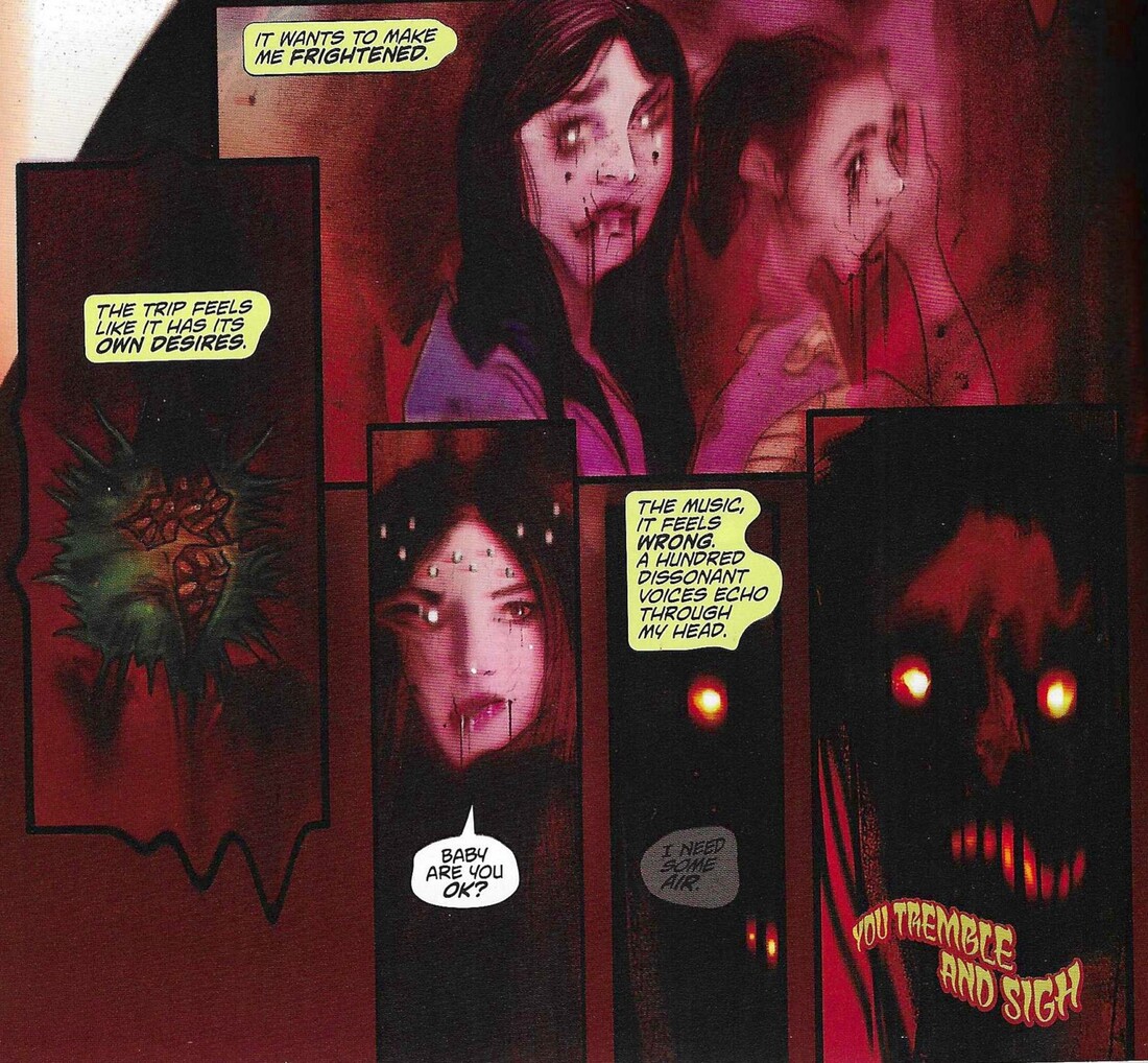 The last thing I read by her, Somna, had the same problem, while the previous thing I read by her, Barnstormers, worked a bit better because it was brighter. This is brighter than Somna, true, but when she gets into the horror stuff, it gets darker, and it’s occasionally difficult to see what’s going on clearly. She does some fun stuff — Vera’s electric blonde hair is amazing, for instance — and her style suits a weird, supernatural vibe, as she shows weird stuff happening in the margins that might be real or might not, and it’s pretty neat. When the ladies are experiencing the world in an altered state, Lotay bends the art accordingly, even shifting panel borders to make their viewpoint a bit weirder. The biggest problem I’ve always had with Lotay’s art is that her faces are often not expressive enough, and that’s true here, but weirdly, it works for a lot of the book, as the characters are often very blasé about the bizarre stuff that’s going on, so Lotay’s weakness doesn’t work against her. It’s only a few places where it seems like it would be better if we did get more expressiveness, but for the most part, it works with the tone of the book, not against it.