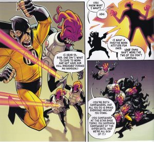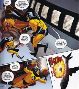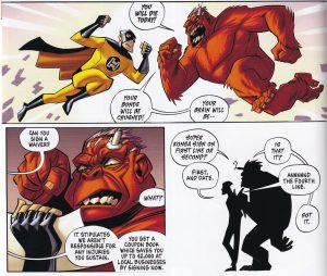 Saul doesn’t want the job, but he takes it because it’s his only option. Patrick cleverly makes him extremely self-aware, so even though he acts like a douchebag occasionally, he’s very much aware of his privilege as a straight white man (he jokes about it throughout) and when he does act like a douchebag, he knows he’s doing it and tries to change his behavior. So he’s a character who fits in well in a comedic comic, but Patrick can show his growth at the same time. The humor comes from the odd situation he’s in, as the superhero company is, naturally, run like an actual company. Things in a big corporation occasionally don’t make sense at the best of times, but throwing superheroics into the mix makes for a good, humorous story. So we get the difference between what it says in the “handbook” and real life, we get changes to said handbook for seemingly no reason, we get sexual harassment seminars because Saul saves a woman the only way he can – by grabbing her by the breast – and we get people being promoted for no other reason than they kiss ass.