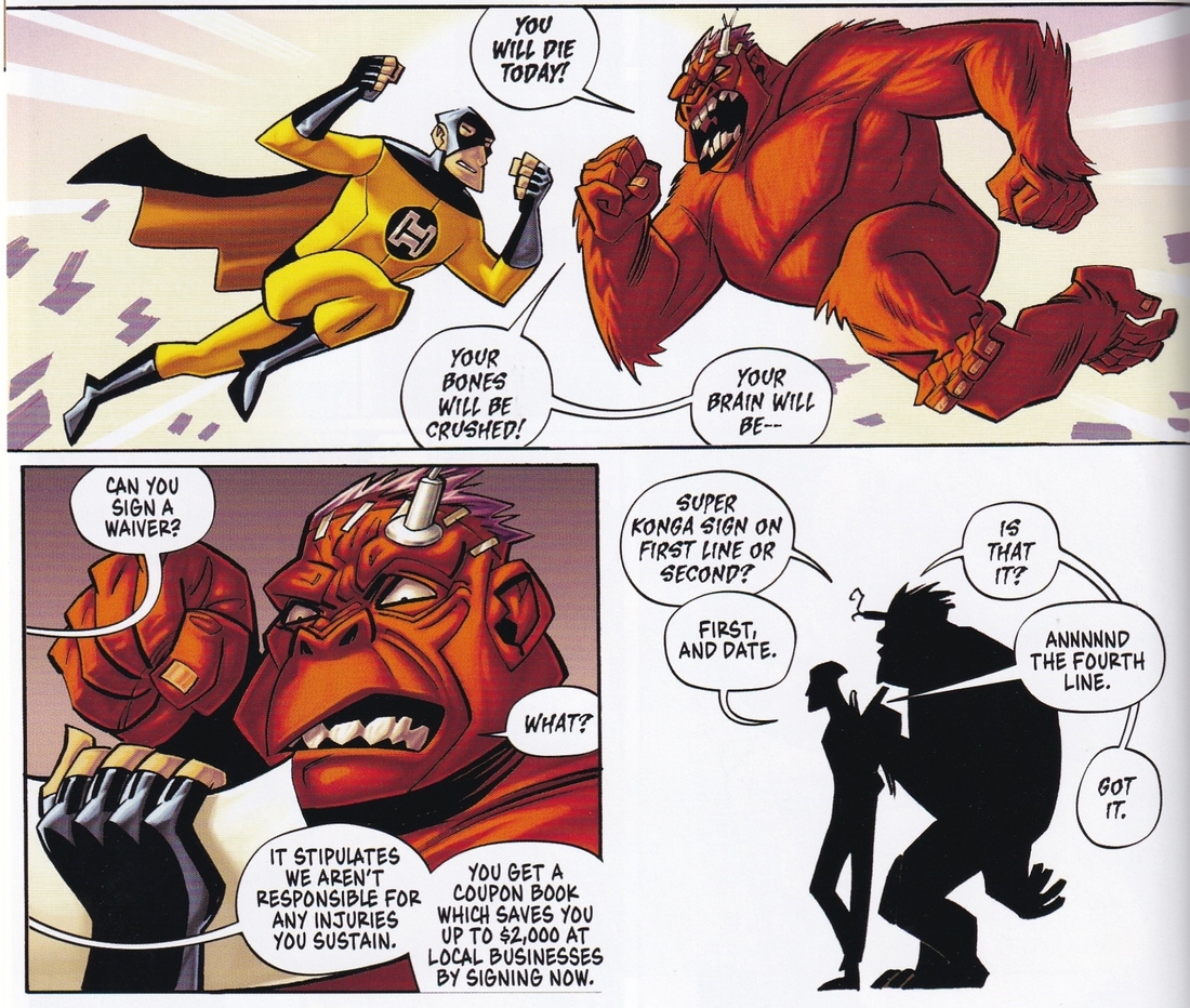 Trigo’s cartoonish art is nice, too. He has a good, bold line and he doesn’t overhatch, so the comedic aspects of the art come through very clearly, and he does well with a “rubbery face” syndrome, showing the effects of violence hilariously. The people taking the serum aren’t all built like superheroes, and Trigo does a good job showing that (the serum gives them strength, but it’s obviously “magic” strength because they don’t develop muscles all of the sudden). He comes up with goofy costume designs, which works with the DIY ethos of the villains, juxtaposing them with the “corporate” superheroes (the villains don’t seem all that bad, they’re just people kind of pushed to the limit by society). Along with this, he thinks about what kinds of clothing the characters would wear, which helps show a bit of their personalities.