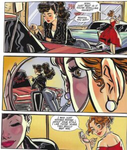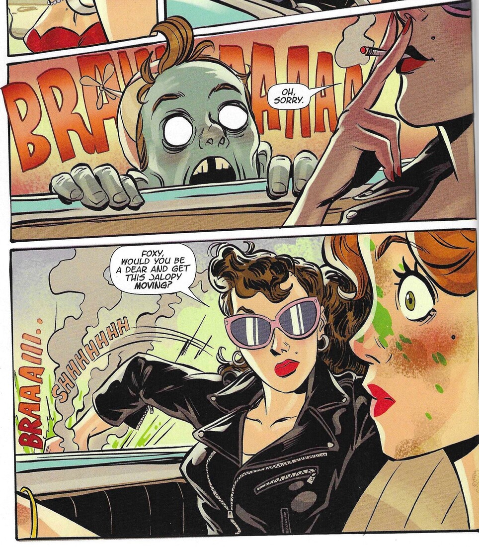 Tarusov leans into the 1950s stereotypes, but it’s all for fun. Foxy, as I noted, is a stereotypical “1950s good girl,” while Roxy is a stereotypical “1950s bad girl,” with the cigarette and the cool sunglasses and the leather jacket and tight jeans. She and Foxy try to figure things out, of course, but it’s clear from the beginning that Roxy kind of digs Foxy, so while she’s keeping a level head about the zombies and then the aliens, she’s also trying to get Foxy out of her comfort zone, while Foxy, as a stereotypical 1950s good girl, can’t even conceive of a romantic relationship with Roxy. The book might look like it takes place in the 1950s, but of course it’s progressive, and Foxy slowly begins to reciprocate Roxy’s feelings. Tarusov has some fun with some “sex comedy” hijinks throughout, but there’s also a nice depth of feeling as the two young ladies get closer to each other. There is, of course, a bunch of wacky action, and Roxy and Foxy have to be tough and smart, and it’s a lot of fun, but it’s nice that Tarusov pays attention to his two leads, as well, and tells a somewhat charming love story in between all the wacky action.