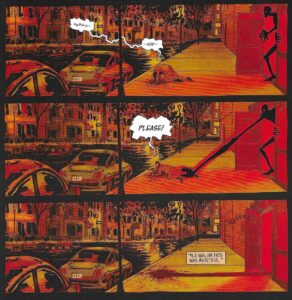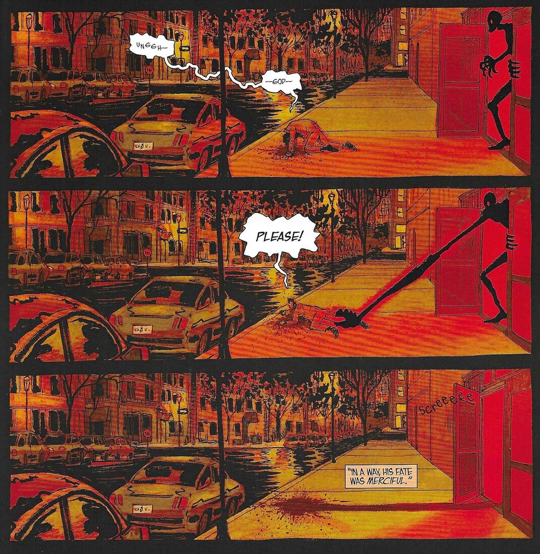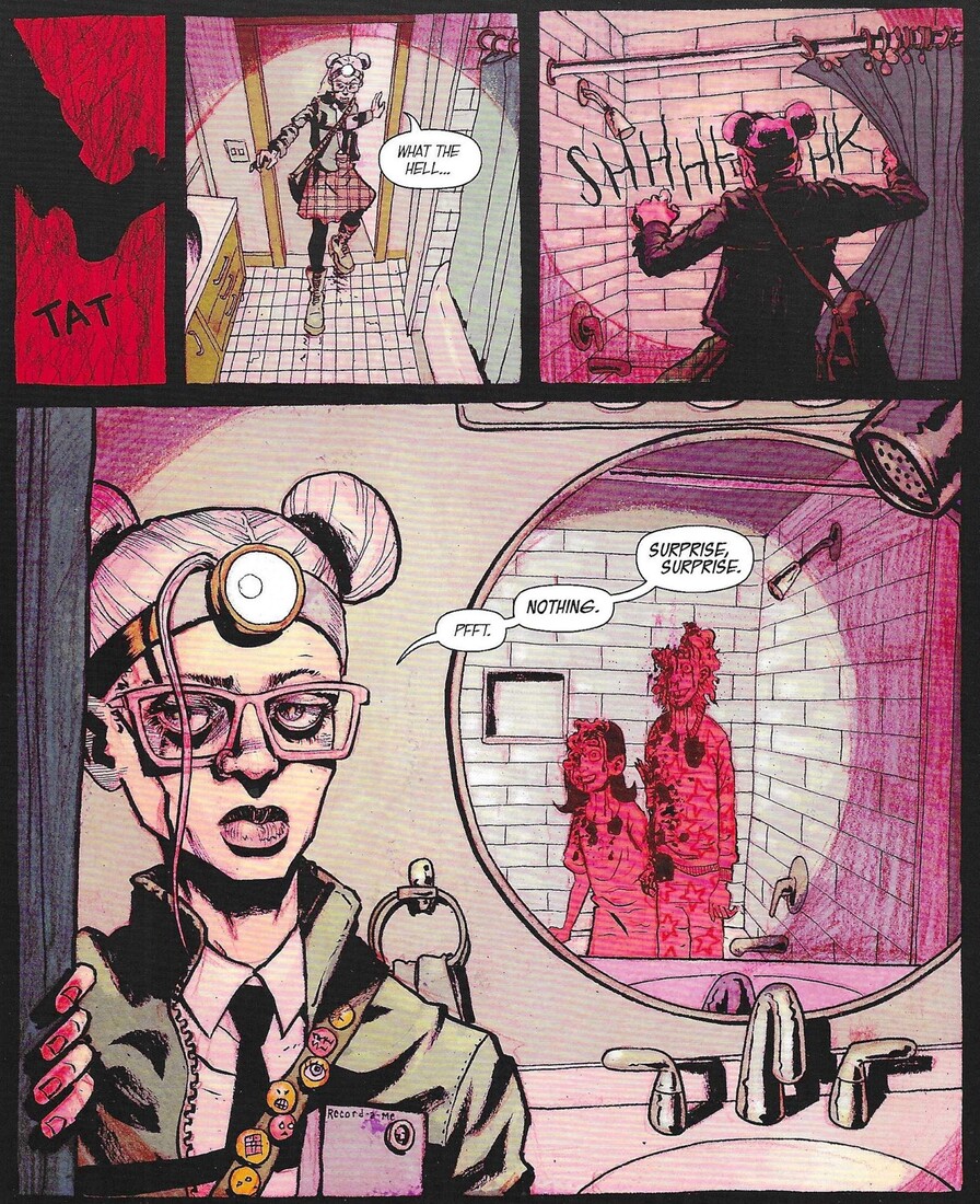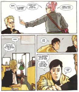 He uses a very rough pencil for the spot blacks and for shading, which adds wonderful texture to the images. When he wants to, he thins the lines out and uses a bit more delicate hatching, which adds a bit of supernatural stuff to the solid, real-world stuff. He designs interesting characters, from Del’s douchebro-coded spiky hair to Holland’s plaid skirt and boots, and his ghosts — such as they are — are very creepy. He does nice, claustrophobic locations that loom up around the characters and hem them in. His coloring is neat, too, as he uses reds really well both to make the ghosts stand out — they’re always colored red — and to make things heat up a bit as Del’s world spirals out of control. But the coloring is also slightly off from primary, which is nifty because it makes the entire book look a bit sickly, as if the world doesn’t quite work because the colors are a bit off. Chisholm does interesting stuff with the page layouts, too, as the book slowly becomes a bit weirder as it goes on, as Del’s world begins to shift out of “normal” reality. Chisholm doesn’t do quite as much odd stuff as he does in a later comic that’s coming up here, but he does some fun stuff with it nevertheless.