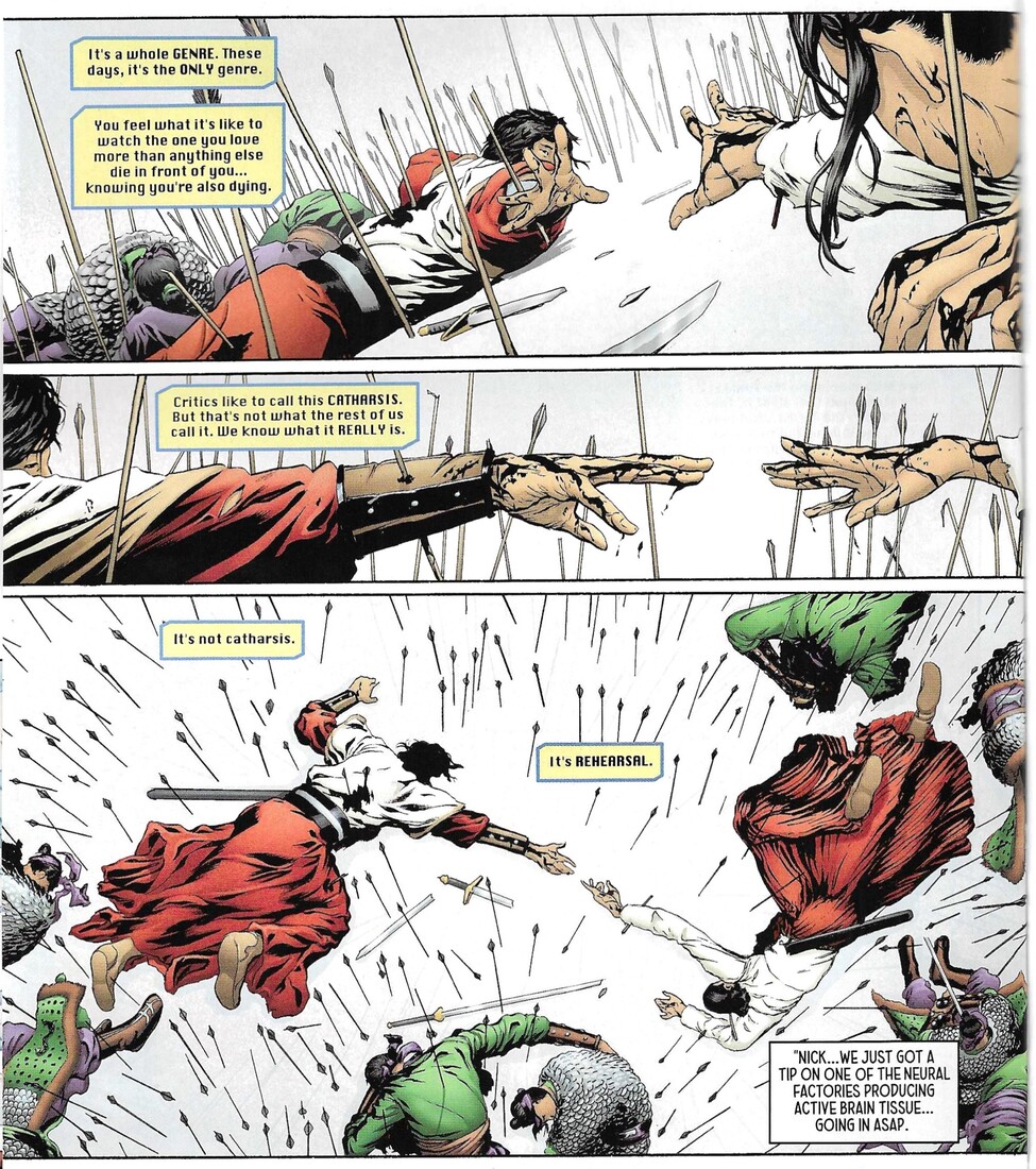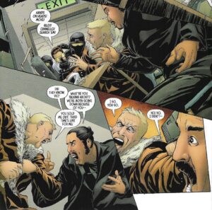 This is a story set 50 years in the future (well, by now it’s 48 years in the future, but that’s fine), and humanity has finally killed enough of the planet that the long clock clicking down to our extinction has become a short clock, with no more than two decades left until Earth can no longer support any life. We get a sinister businessman who, we learn later, is a gangster, teaming up with a scientist to create a new form of humans (which is illegal) so that they can save the world. Sounds good! Of course, this is all illegal, and there are cops on the trail — Nick, our protagonist, and his partner, Denise, get on the case, and they eventually end up at the lab where the humans are being grown. Oh dear. There’s also a persistent reporter who uses her audience to spread chaos, because why not? JMS doesn’t waste much time, as this does lead to a big climax of the volume that resets the board of the world.