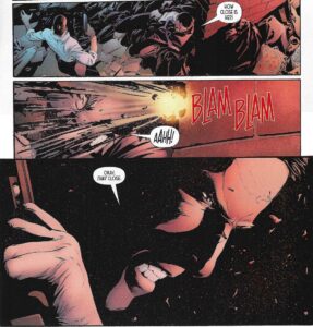 He has such an interesting style — it looks slick, because he uses a thin line and unlike some artists, he’s very meticulous about details (this is neither good nor bad; some artists’ work looks better the sketchier they are, some looks better the more detailed they are), but he also does some rougher work on the margins that always adds depth and nuance to his work. He’s comfortable doing these high-tech environments because his work is so precise and clean, so the tech he draws in his comics always looks very realistic but also slightly sinister, while his ability to scuff parts of the work make it seedier than it might in someone else’s hands, and it lends the comics a slightly broken-down feel, which works in a comic like this. It’s hard to describe, because his work is so crisp in general, but it doesn’t repel you like someone else’s slick work might, because Parker knows how to temper that with roughness. If that makes sense. His crisp line has always worked well on clothing, too, and when it’s important in this story (like the clothing Blake wears, or the clothing Nick’s sister wears), he’s able to bring a nice sense of design and artificiality — in a good way, mind you — to the clothing. Part of this story is about hiding in plain sight, and Parker’s line work helps with that. In the nicest way possible, there’s always a vague creepiness to Parker’s work, and he unleashes it in interesting places and times.