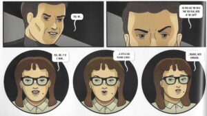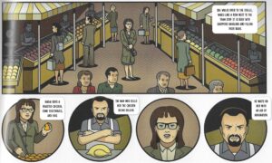 The Hoeys’ comics tend to be very dry and chilly, as they create characters, put them in strange situations, and then use an omniscient narrator to describe what happens in the most clinical way possible.