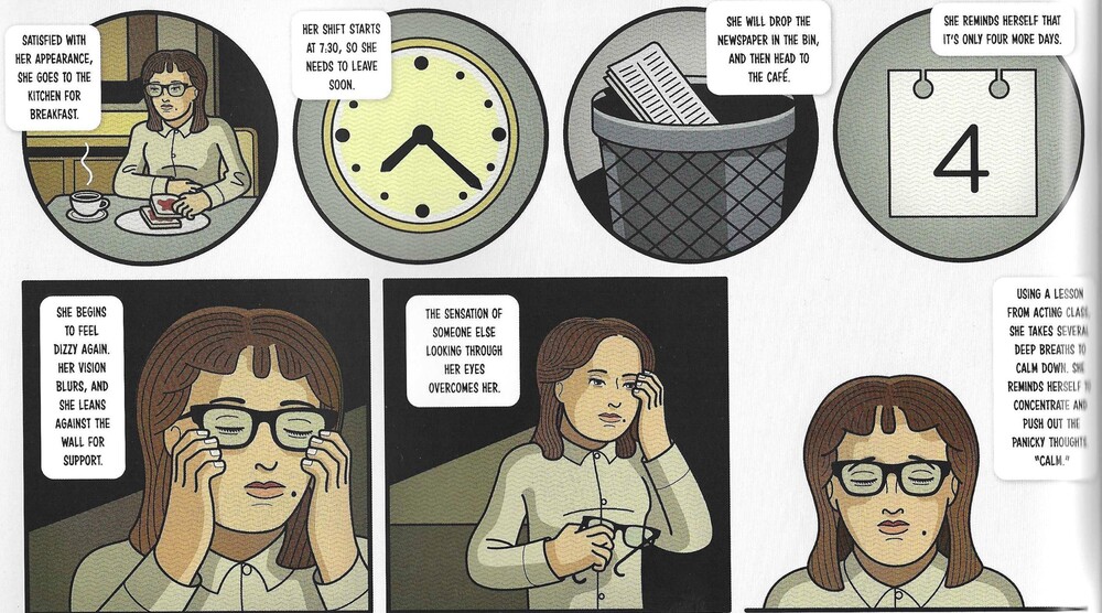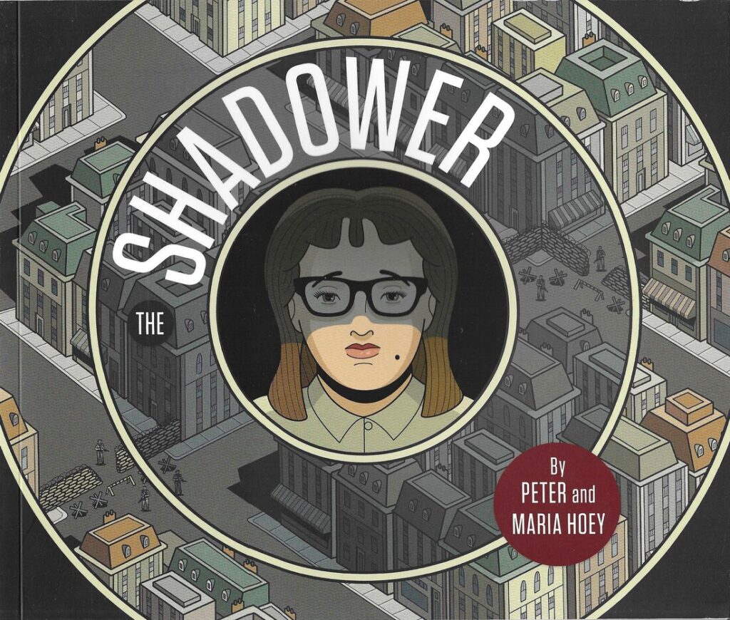 The Hoeys’ previous comic, In Perpetuity, was their noir comic, and The Shadower is their spy comic. There’s a capital city that has experienced a civil war and it’s still divided into sectors, each controlled by a different faction. People are allowed to pass between the sectors, but they need to have passes and their cars are searched, so our main character, Nadia, doesn’t tend to go anywhere. She lives in an apartment with her mother, and her father was an important member of the ruling faction and was killed in a bomb attack some years earlier. Her father was a playwright, her mother was an actor, and Nadia has followed in her mother’s footsteps.