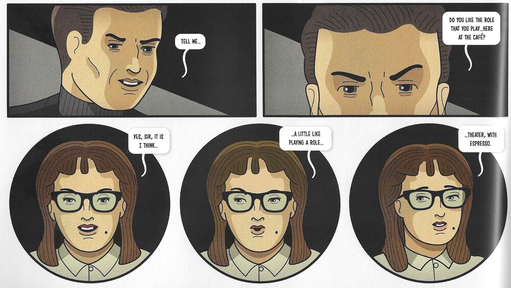 They do a nice job creating worlds for their comics, as Nadia’s city is a depressing, rainy place that fits the dour and seemingly ultimately futile games these men are playing, and their characters are interesting to look at. As Nadia transforms into Miriam, they do a nice job showing all the small things that go into it, which is neat. The Hoeys also make a lot of their characters blank slates, as if their faces don’t quite work, which adds to the weirdness of the narrative but also jars us when they shift just slightly, either by looking somewhere else in a panel or smiling or scowling a bit. It works really well, especially in a story like this, which is all about artifice. When the façade cracks, even just for a moment, it’s very effective because of what we expect of the art. It’s difficult art to love, sure, but it’s still done well and with an interesting purpose.