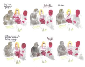 Robbie isn’t the greatest dude in the world, though, as Naomi’s story shows. He doesn’t do anything horrible, but he outshines her, too, and so her night ends a bit sadly. Robbie takes her through the club and out into the city, and she has a marvelous time. After they have sex, though, it’s like she realizes that she’s a tourist and she comes back down to earth, and while Robbie doesn’t really do anything bad, she feels like he’s already moved on from her. It’s another small moment in which there are no villains, just two people who don’t really know each other and have no future together. At the beginning of her story, Naomi is shy and unsure about her attractiveness, and she forgets that in Robbie’s presence, because of his star wattage. Once that turns away from her, all her insecurities come rushing back. It’s natural and it happens to us all, which is why it’s so painful to see it happen to her, even though Robbie has not done anything wrong. The people in this book are all like that — nobody is evil, but they occasionally do things that make others feel bad, often inadvertently. You know, like real life.
