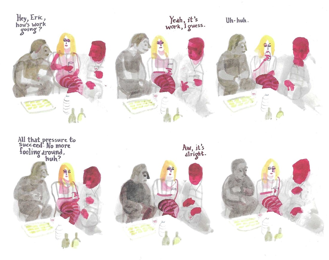 Now, this might not so interesting, and if you’re a big fan of plots, it’s not. I like a good plot, but Evens is more interested in the moments between people and what they do in those moments, and The Wrong Place is a fascinating study of people. At Gary’s party, everyone talks about Robbie as if he’s some mystical presence, and Gary doesn’t seem to mind, but it still feels very insulting … until you realize that Gary has that whiff of desperation about him, and while we can pity that, there’s also a bit of contempt for him, too. Characters like this are common in literature, and it’s easy to both pity and loathe them a little, and Evens is good enough that we feel those things, but we also can’t hate him too much, either, because he still seems like an ok dude. It’s not his fault that he’s friends with a shining star, and it’s made better by the fact that Robbie really is a good guy — he has no contempt for Gary, and when they meet at the club, they have a good time. But Gary can’t help who he is, and he’s someone who isn’t happy with who he is (even though he tries to hide it) and can’t compete with Robbie. He also wants to hang out with Robbie as much as his guests do, and at the club, when he gets to hang, he seems much freer and happier.