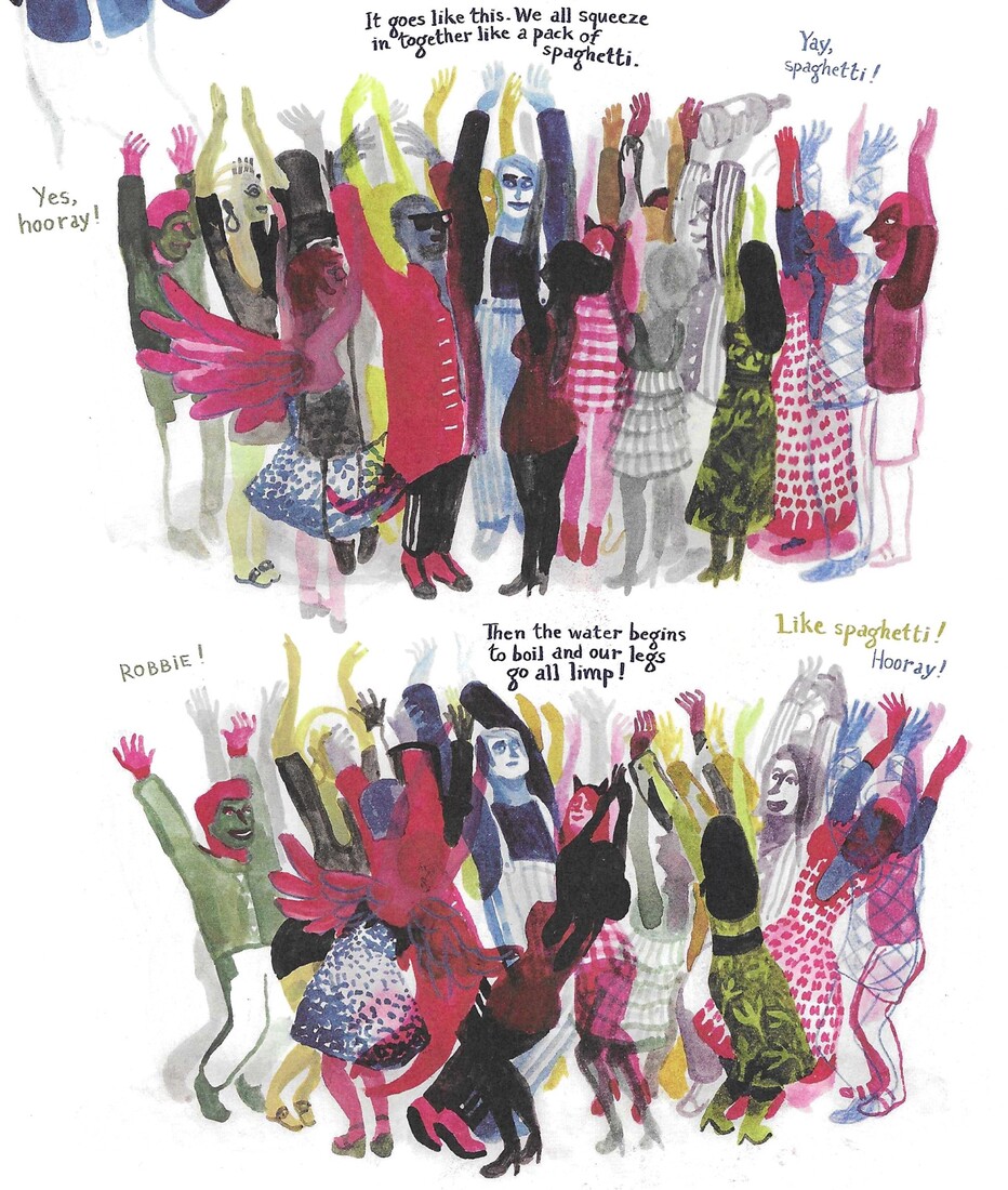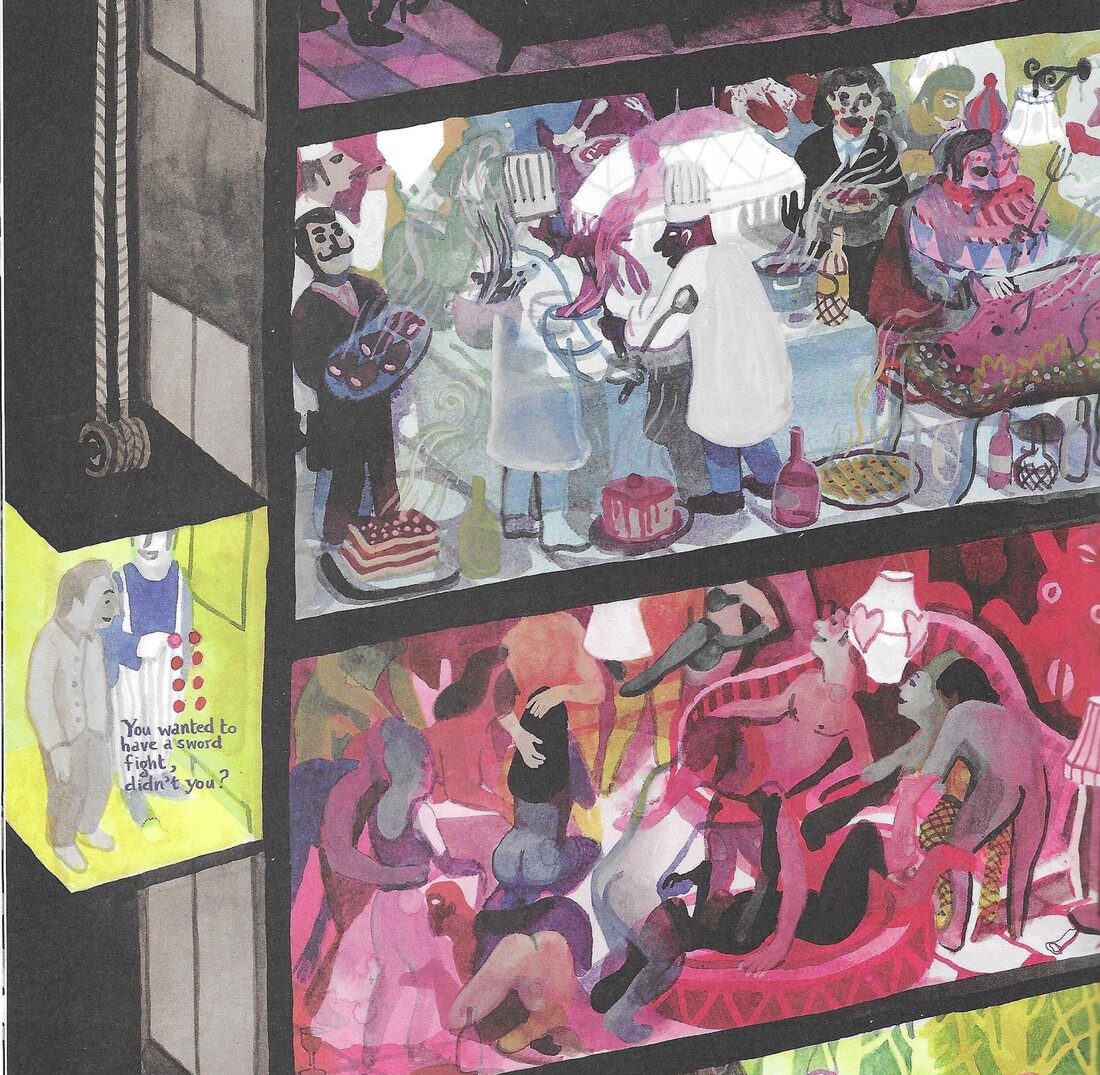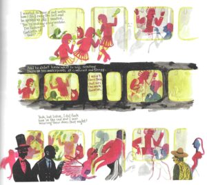 Evens’s art is always a highlight, and he uses it well in this book. He paints everything, which makes the entire book very lush and vibrant. He creates amazing and unique characters and puts them into a wild city, full of mysterious and sensual pleasures. He begins, as I noted, in Gary’s apartment, which is quite boring, and then introduces elements from the city and the Disco Harem, which opens up the entire world of these characters. During the party at Gary’s, where many people are quite colorful and fun, he uses more white spaces around each “panel” to create a sense of isolation and loneliness among the people, even as many of them have intimate conversations. It’s as if Robbie’s absence is crowding out everything else, and the small pockets of friendship among the characters can’t quite overcome it.