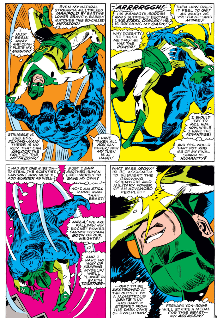 Speaking of Mar-Vell, Arnold Drake takes over Marvel’s Space-Born Super-Hero Captain Marvel with #5. While I was disappointed in Drake’s first issue of X-Men (he’s improving steadily though), here Drake does way better than previous scribes Thomas and Stan Lee. His plot involves the Metazoid, a Soviet scientist who mutated himself into an indestructible entity for space exploration. Instead, his Red superiors send him as a supervillain to capture Walter Lawson, the American scientist Mar-Vell poses as. Much like Soviet spy Col. Brevlov, the Russian is shown to be a decent sort, albeit willing to do his duty when push comes to shove.