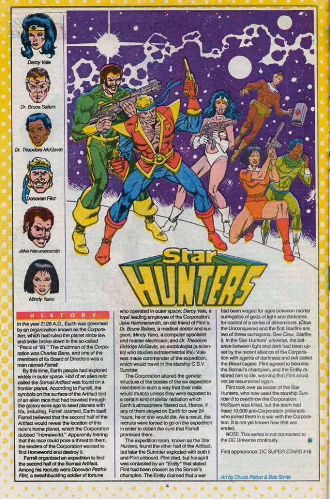 Darcy Vale, Donovan Flint, Dr. Bruce Sellers, Dr. Theodore McGavin, Jake Hammersmith, and Mindy Yano. Their ship was the Sunrider. A lot of folks got this one despite the comics never having been reprinted; most said they found the Star Hunters in their copies of Who’s Who, the page reprinted above. Still, the actual series deserves a reprint collection just for the stunning Don Newton artwork. Get on that, would you, DC?