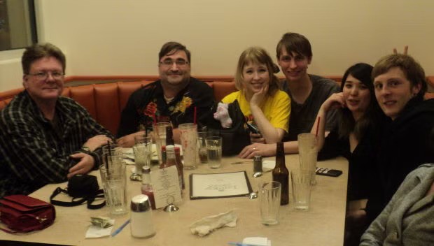 Anyway. Having a great weekend despite working two shows — I must be crazy — and I should have a full report next week. In the meantime, you can enjoy this shot of me, Greg Burgas, and Katrina and Lindon with their respective spousal others (!! Agh! I’m OLD….!!) all being silly last night.