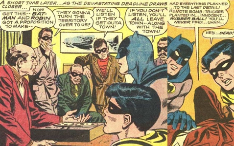 Batman and Robin enlist the aid of the local mob to try to ID the extortionist from the tape of the phone call to Gordon’s office. (The ‘death trap’ on the cover is just the Dynamic Duo fighting their way in to see the mob kingpin in his office.)