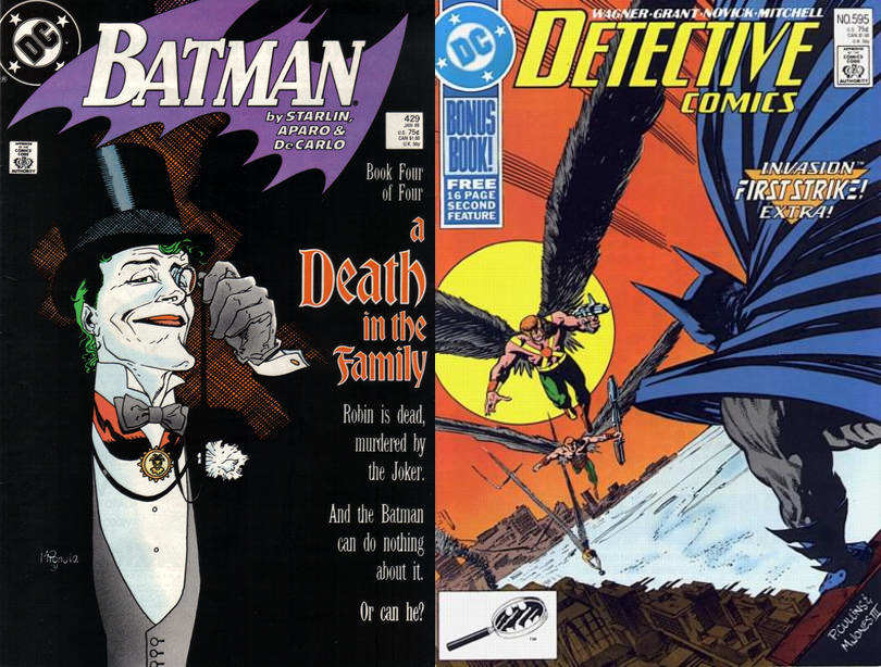 Batman #429 was the last chapter of “Death in The Family.” This was when Jim Starlin was on the book and he seemed determined to bring us everything bad about post-Watchmen ‘dark’ superheroes, culminating with this story built around the 1-800-KILL-ROBIN stunt. That remains, to my mind, one of the lowest points in the history of the title. And Detective #595 was a lame tie-in to Invasion! — Alan Grant and John Wagner were still new on the book, Norm Breyfogle had taken the month off, and this tie-in to a not-very-good crossover was not their finest hour.