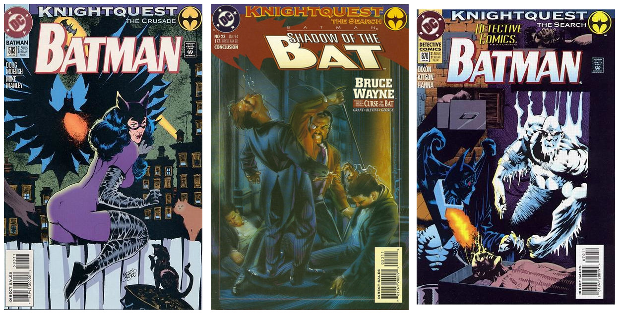 Well, the regular books — Batman #503, Detective #670, and Shadow of the Bat #23 — were all in the middle of “Knightquest.” The saggy second act of the Knightfall Saga.
