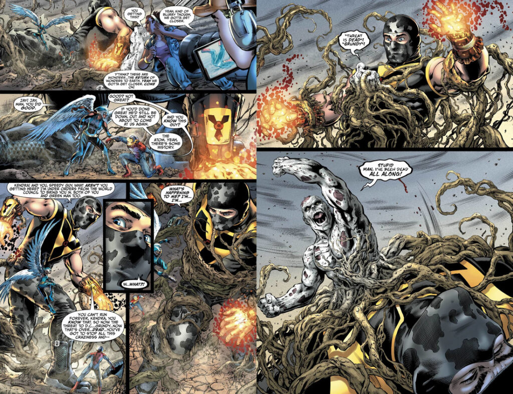 Specifically, in the first collection, we’re introduced to a re-imagined Green Lantern, Flash, Hawkgirl, and Atom, fighting a re-imagined Solomon Grundy.
