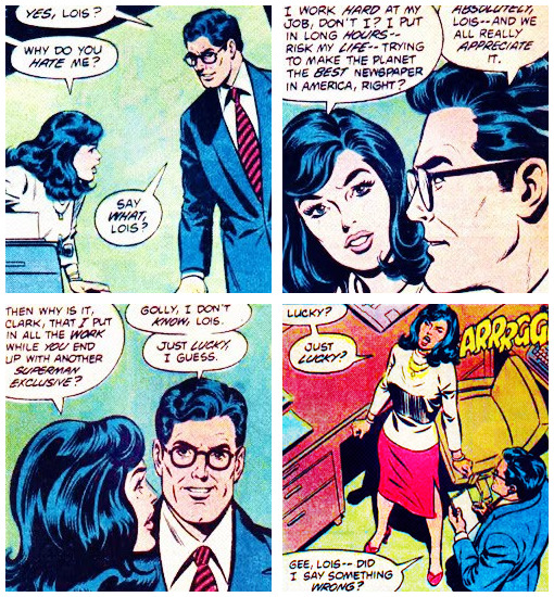What’s more, the Clark Kent/secret identity stuff, which I’d always liked — even if I thought Lois was a bit of a bitch about the whole thing — wasn’t given very much play. I liked the contrast between the cosmic-scale Superman and the earthbound, nerdy Clark. When there was no Clark Kent in a Superman story — even just the standard scene of a lame excuse and a dash for the stockroom — I missed him.
