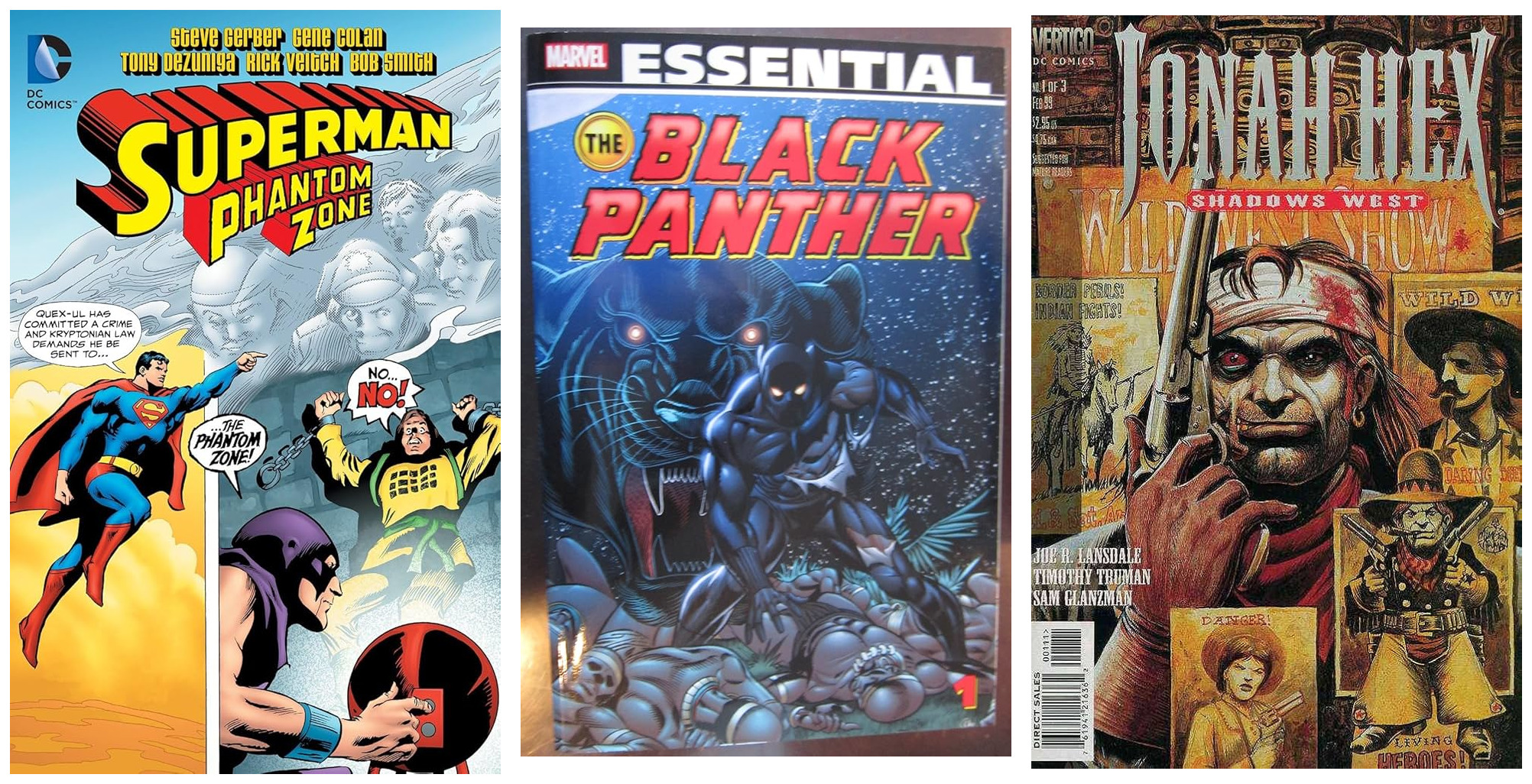 Look at the list. DC finally got around to doing Gerber and Colan’s Phantom Zone mini-series [Edit: Woof! come on, DC, get that back in print!], and Marvel eventually got off the dime with Essential Black Panther [Edit: Of course, FSM forbid the Essentials program stayed in print!]. And at long last DC is giving us more Jonah Hex — not just the long-overdue next volume of Showcase Presents Jonah Hex [Edit: How shocking — something else that’s out of print!], but a collection of all the Vertigo Hex mini-series from Joe Lansdale, Tim Truman, and Sam Glanzman under the umbrella title Shadows West [Edit: Why is this out of print? Come on, DC!].