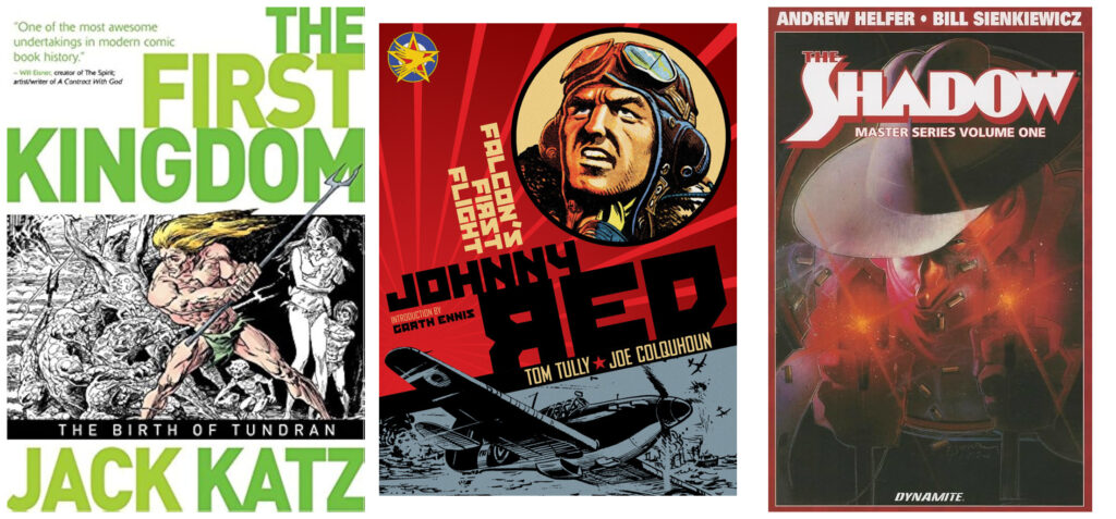 And it’s not just Marvel and DC, either. Titan Books is giving us beautiful new hardcovers of Jack Katz’s The First Kingdom [Edit: Why is that out of print — it’s so cool!], and their collections of British war comics are a continued delight … I’ve mentioned Major Eazy and Johnny Red here before, and Garth Ennis presents BATTLE CLASSICS [Edit: Siiiigggghhhhh …] is on deck for next year. Dynamite Comics, in addition to doing some really great brand-new comics with the Shadow, have also been very good about bringing the older ones back into print — the paperback version of the Howard Chaykin mini-series is already out, and the Helfer-Sienkiewicz ongoing that spun out of it is getting a collection early next year.