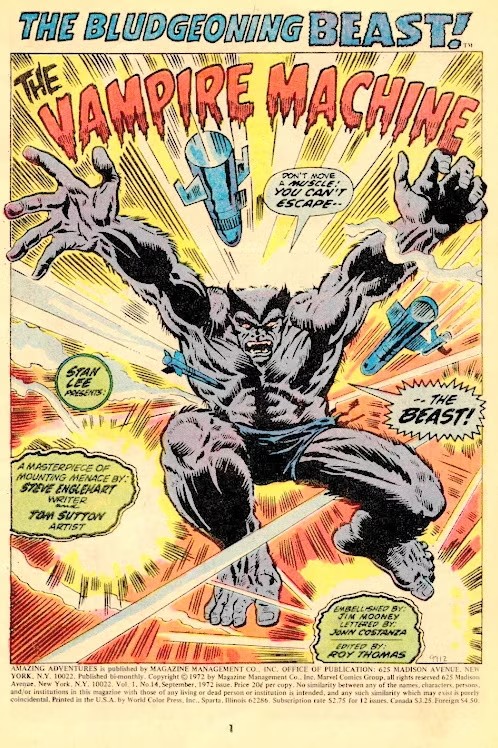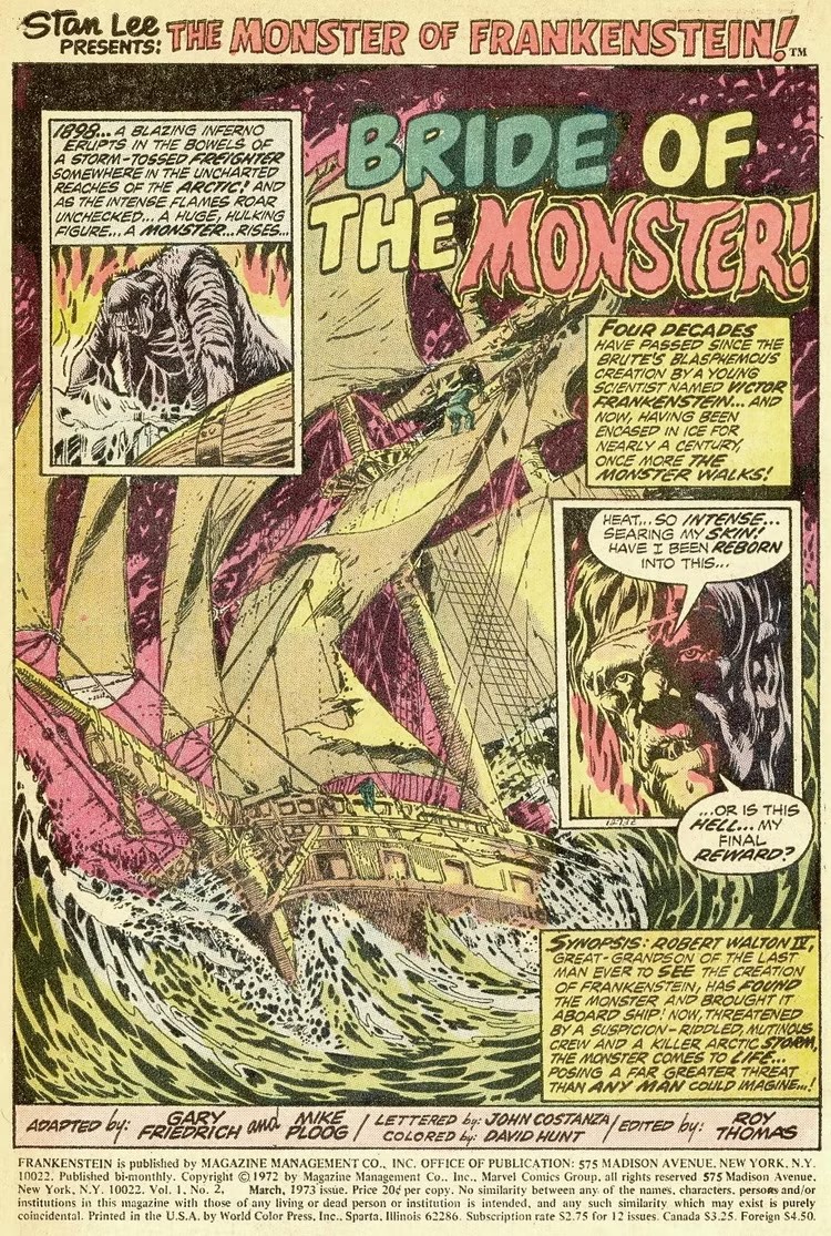Marvel had a slightly different approach than DC, but they were just as good at constructing an intriguing splash page back in those days. Here’s MONSTER OF FRANKENSTEIN #2, which was my introduction to both Mary Shelley’s creation and also to the magnificent work of artist Mike Ploog.