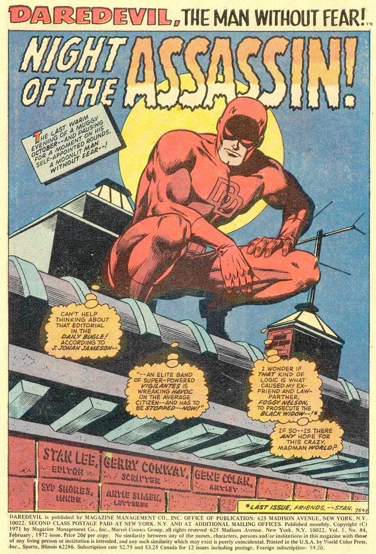 A splash page technique you used to see a lot at Marvel was the hero thinking about what a mess things were (and in so doing, providing a handy recap.) Like Daredevil, here …