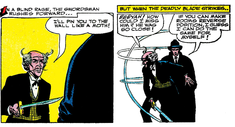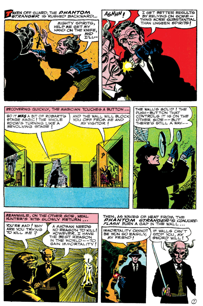 It’s an effective story unless you stop to think about it. How did Wright know what the other two men hoped for? How did he train the horse so swiftly? What the heck was the Phantom Stranger doing on that plane? The third story, “House of Strange Secrets,” works better as the Stranger battles a stage magician in a house wired for tricks.