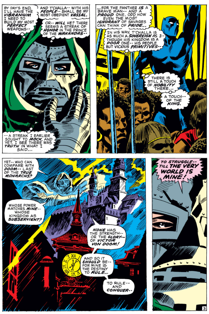 Realistically speaking, it’s entirely plausible a European man of Doom’s age (like Reed he was in college before WW II) would be a racist looking down on T’Challa and the Wakandans as primitives. Nevertheless, while I am fine with Doom as a backstabbing, treacherous, murderous megalomaniac, I’d rather he not be a racist.
