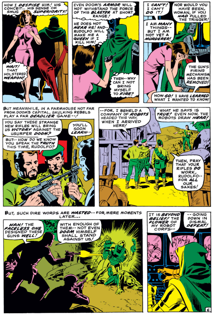 Written initially by Roy Thomas, it’s no surprise the series fills in a continuity gap, showing how a Romani nobody became the monarch of Latveria. First, Doom captured Rudolfo, the crown prince. Having removed the king from the throne Doom could have claimed Latveria by force. Instead he had a robot of Rudolfo hand over the crown, legitmizing Doom as the new monarch. Now, however, Rudolfo is leading a revolutionary movement against Doom, with the help of an alien called the Faceless One.