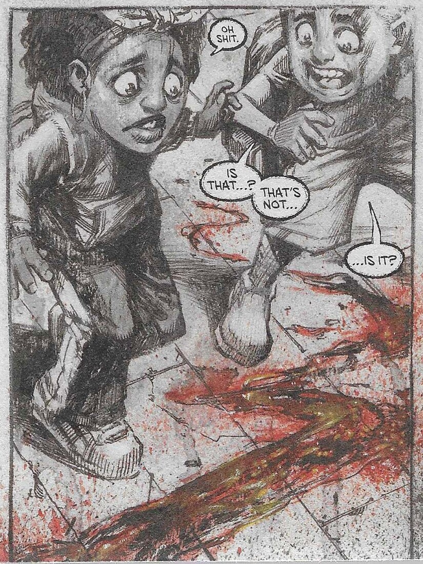 Well, first of all, these are terrific comics. They’re six dollars each, yes, but the main stories are quite long, and they both have back-up stories, with Cul-De-Sac including a preview of another new comic. They back-ups (by Doug Wagner and Adam Pollina in Cul-De-Sac and by Joshua Dysart and Kano in The Hero Trade) are very different, tonally, from the main stories, which is kind of nifty. Plus, they use old-school pulpy paper, which hits me in the nostalgia bone (after which I should really see a doctor, but I have things to do!). So they’re good packages all around. I’ve never been the biggest fan of Carey, but he does a nice job with Cul-De-Sac: there’s a tight-knit group of families who live in the suburbs (on a short street that ends in a bit of a circle … I wish someone knew the name of such a configuration!) whose kids go on annual camping trips. This time, one of the moms takes them, and reveals to them that they’re vampires … but higher-order vampires, ones that can reproduce (hence the children) and they don’t suck the blood out of living things, they just … kind of suck the life energy out of them, which disintegrates them. She does this with a bunny, which is probably not the best thing to do with children — she couldn’t have used a disgusting animal, like a bunch of cockroaches? Her demonstration freaks the kids out (well, most of them), and the mom leaves them alone to deal with it and returns home. Unfortunately for her, a team of vampire hunters has tracked them down, and when the kids return, all their parents are dead. Oh dear. The kids, of course, swear revenge!!!! It’s a decent hook, and Carey does a good job introducing the various characters (there’s a nice sequence introducing the vampire hunters), and Wayshak’s art is superb. It’s sort of a Sam Kieth vibe, which is neat, and he uses colors to very good effect, as not all of the issue is colored, so the black-and-white contrasts with the colors very well. I’ve never seen his art before, and it’s very, very keen. Meanwhile, Kindt and Lapham have an interesting story about two people who work for a corporation that seems to be developing superheroes, or at least trying to turn superheroes into agents of corporate policy. Our two workers, Hank and Ingrid, are the contacts for the two teenagers, who have powers but are kept under lock and key inside the corporate headquarters. Hank and Ingrid are also having an affair, which is strictly forbidden by the company, so they’re being careful about that. It’s unclear how much of what they tell the two kids — brother and sister — is the truth, as they keep the kids docile by telling them that the world is basically a wasteland, but we don’t see much of the world, so it’s unclear how much of their story is a lie. The brother — Trey — is clearly not right in the head, while the sister — Trina — is a bit more mature than her age (they’re not 18 yet, which is how the company justifies keeping them confined in their rooms). Kindt does a nice job building tension throughout, as the corporation is extremely serious about security, so Hank and Ingrid really need to be careful, and when the company does let Trey and Trina out to be their superhero selves, the results are pretty horrifying (and also somewhat hilariously familiar, but I don’t want to spoil anything). It’s a paranoid thriller in the best tradition of these stories, just with superheroes. Lapham is always good, of course, and he brings a grounded realism to it all.